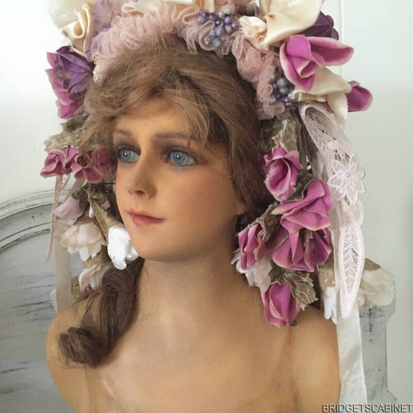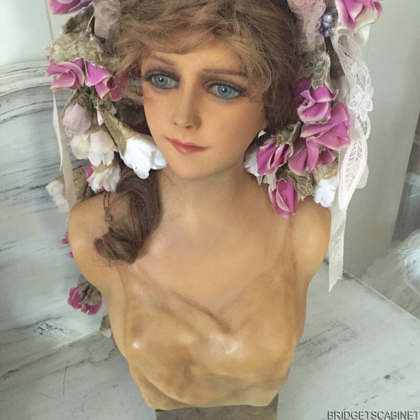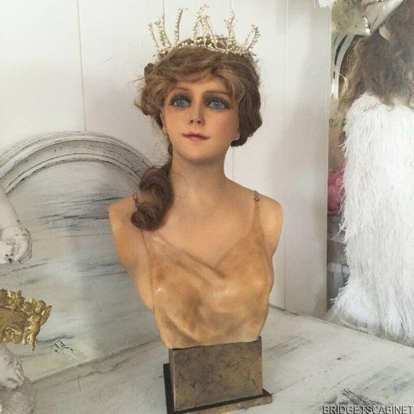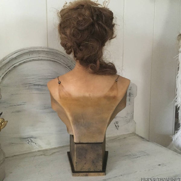 A beautiful antique French Child Bust with a really adorable face. She has these stunning sparkling blue glass eyes, it's a young girl's Wax Bust, standing on a art deco stand. This wax bust is really in perfect condition, she survived all this time being carefully stored with a collector. It is a wig bust and she wears a wig, these kind of busts were used in the French " Magasins" to show wigs, hats and/or jewelry. As you can see in the attached pictures the bust is shown in different poses and different accessories so yo will have an idea what you can do to change appearances. if you have any questions about this beauty, don't be shy and drop me a mail. The total height is 22.05 inch