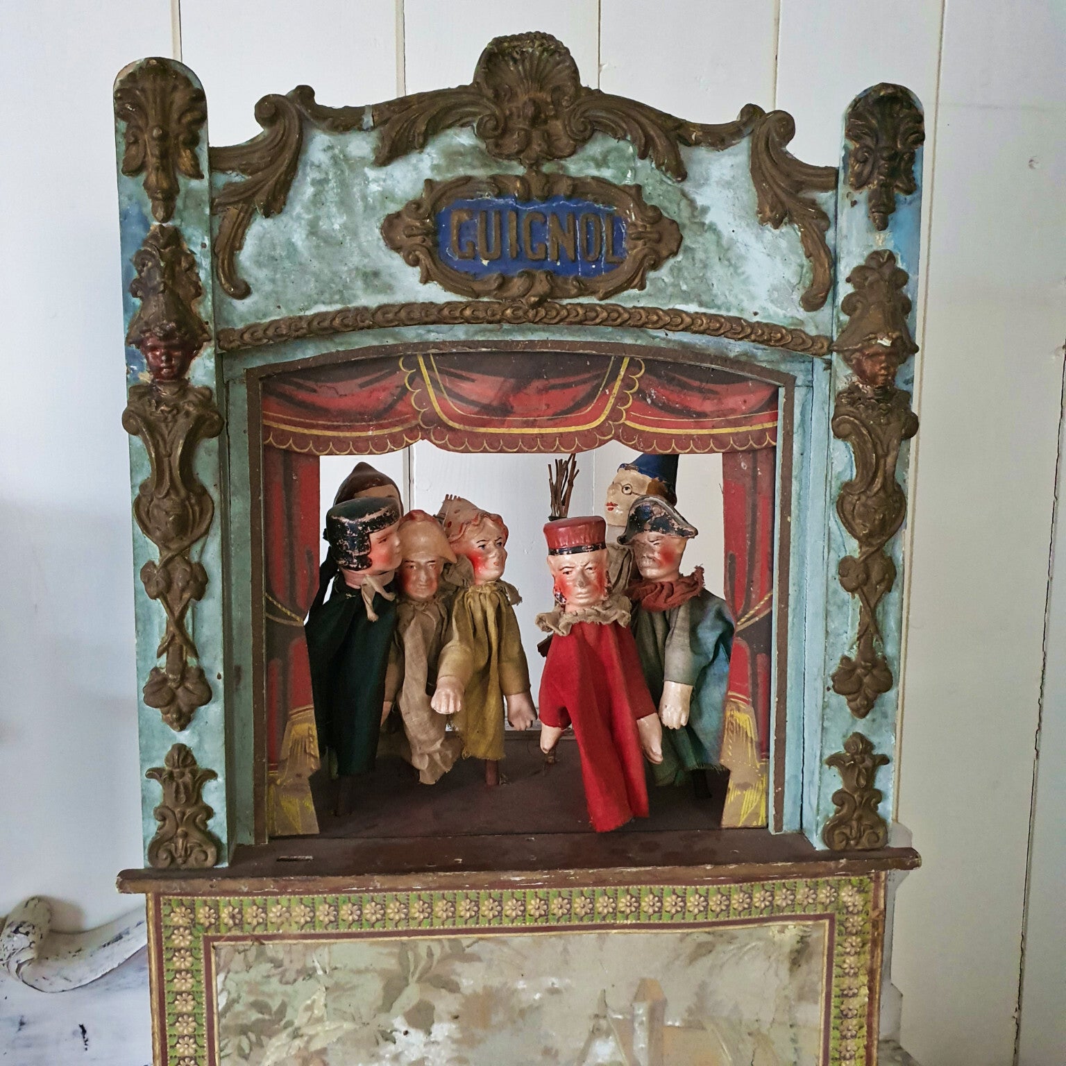 Bridget's Cabinet found this beautiful 19th. Century french Guignol puppet theatre, it comes with 7 original Guignol puppets they are displayed on an installed shelf, they are removable. it is a medium-sized theatre which are very hard to find, the height of this theatre is 37,4 inch. it still has all its stunning vibrant original colours, it has a nice hand-painted scene on the front. As mentioned this theatre comes with 7 original hand-made Guignol dolls which is a very unique find. These were the toys for the wealthy in those days. Considering it is about 140 years old this beauty is still in very good condition, there is of course some wear, all the stunning ornaments on the front are still complete, the front is a stunning patina like blue
