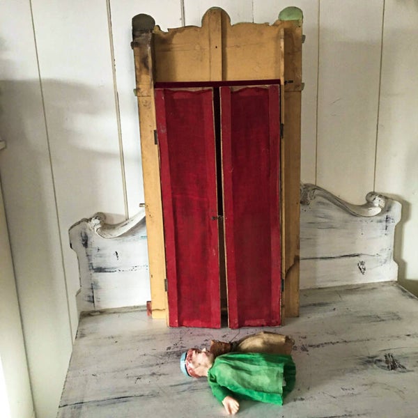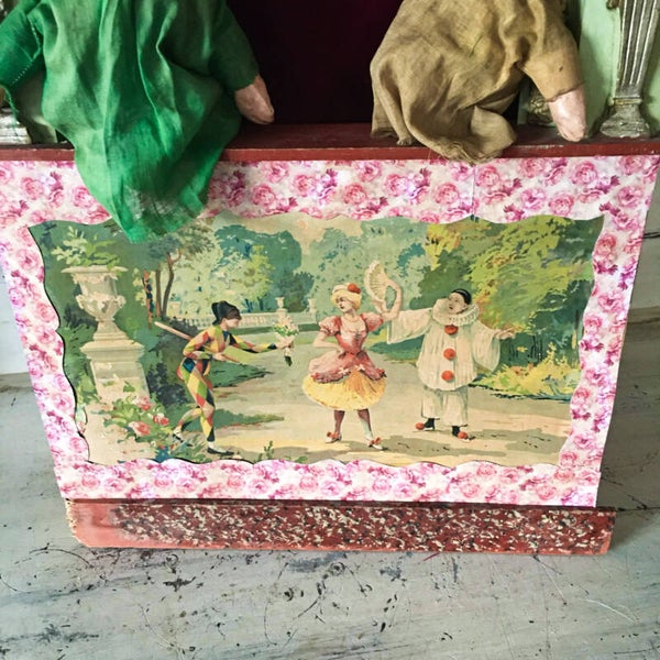 Bridget's Cabinet found this beautiful 19th. Century french Guignol puppet theater, it comes with 2 original Guignol puppets. it is a medium sized theater which are very hard to find, the height of this theater is 31,4 inch . it still has all its stunning vibrant original colors, it has a nice hand painted scene on the front. As mentioned this theater comes with 2 original hand-made Guignol dolls which is a very unique find. These were the toys for the wealthy in those days. Considering it is about 140 years old this beauty is still in very good condition, there is of course some wear, all the stunning ornaments on the front are still complete, the front is a stunning patina like green. it still has its rollable red velvet curtain