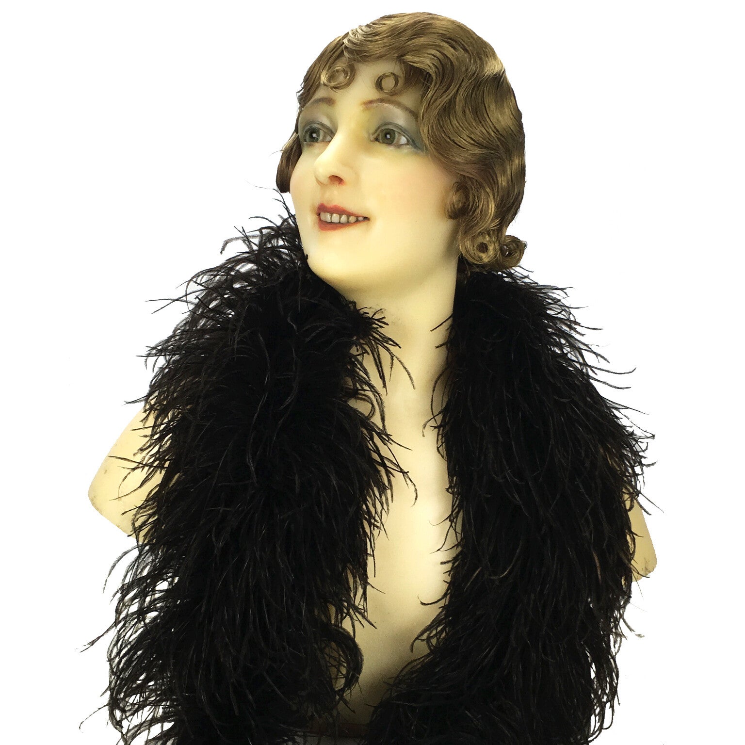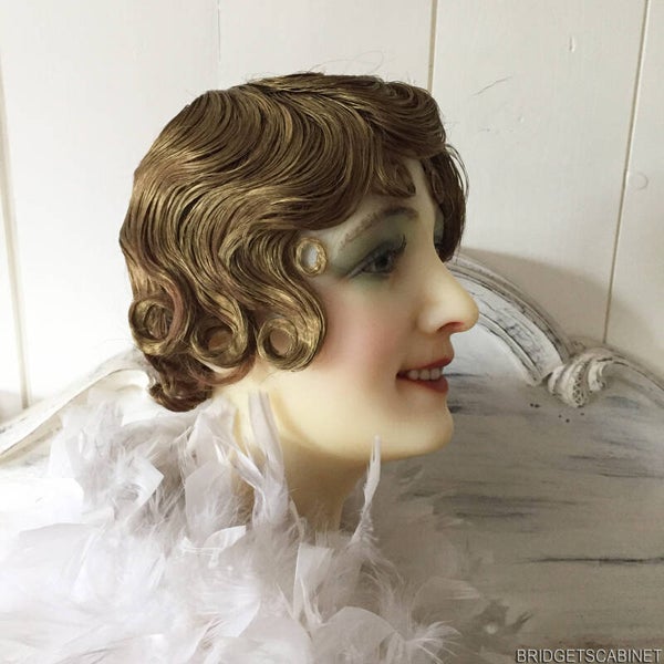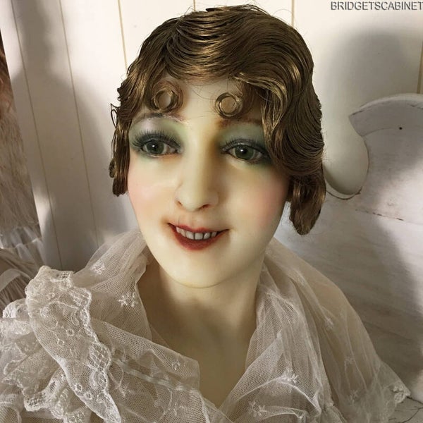 A stunning antique French wax mannequin bust, once part of a full size mannequin, probably used to show beautiful clothing in the fancy Parisian fashion stores. She has a beautiful "old fashion" face with mesmerizing green glass eyes, porcelain teeth and she is signed on the back as can being seen in the pics. her hair is gone, you see that a lot at these old busts, it is probably gone because they sometimes just cut all the hair, because it was easier to change wigs, hats and/or clothing that way. you can dress her up with an antique wig, cloche, hat or what ever? she will always have this beautiful appearance. we dressed her up with a flapper wig which gives her that 1920's look. She is really in a very good condition considering she is more than 100 years old, she has however a very small hair line on her upper lip and beside her eye but you can barely see it with the naked eye. this is a unique treasure which survived time. a real gem for the collector. the wig and accessories are not included.
