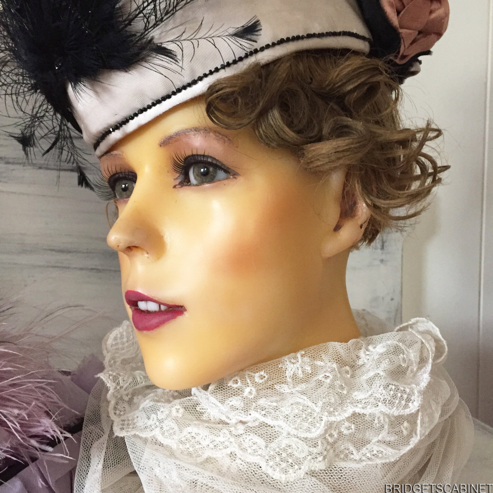 A gorgeous antique French Wax flapper girl with beautiful sparkling glass eyes and porcelain teeth. She has a 1910/20s hairdo, Flapper style. She has a beautiful expression on her face, very detailed. She is in perfect condition, she still has her hair, and her face is spotless, there is however a small piece missing but this is on her neck, you can see it in one of the pics. but this should not be any problem if you dress her up a little just like we did that, you can't see a thing. with the wax items, there is always something but this face is in such perfect condition. this wax head is probably used in the French "Magasins" for displaying hats. She is Life-Size, The height of this beauty is 12.59 inches If you want to know more, please do not hesitate and drop me a email!!! we also do very comfortable layaway plans.