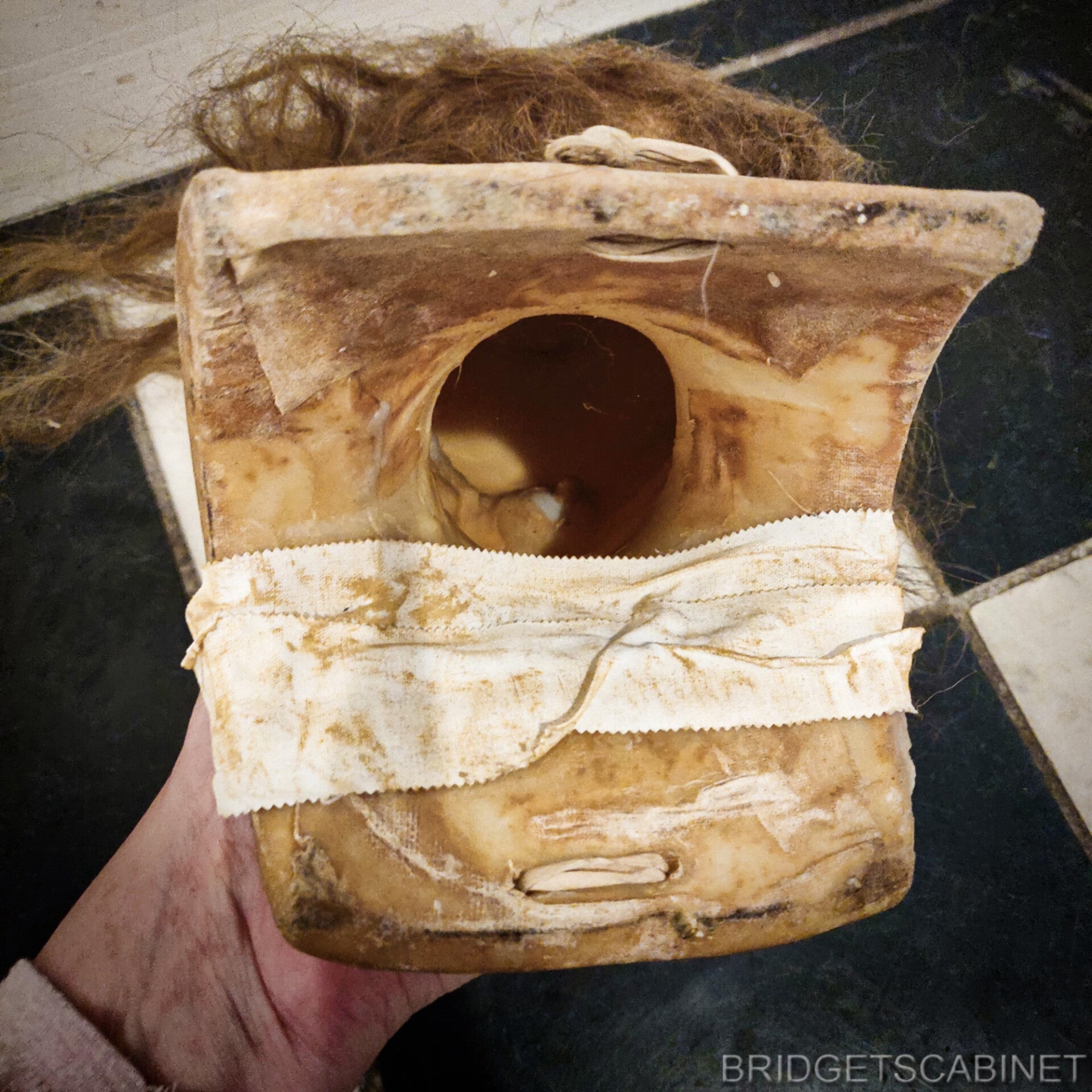 About her overall condition: she has an old repair on her breastplate and she is missing her underarms however when dressing her op a little you can convert her into a little angel.