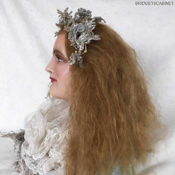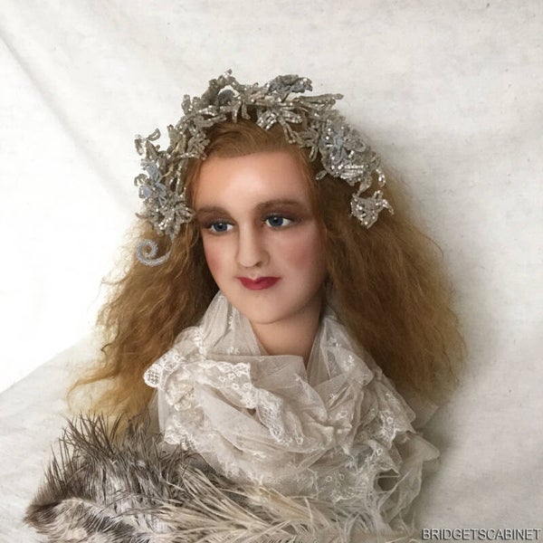 Bridget's Cabinet found another beauty, this stunning antique wax mannequin head from the early 1900s with a lovely facial expression. She still has this enchanting long hair, still her original implanted human hair. The hair is in perfect condition, perfect to be styled in any style you want. This is very unusual for a wax bust this age. in the pics you see we gave her 2 different styles. She also has these beautiful blue glass eyes. She is of course Life-Size. The head is really in perfect condition, however, we have to mention a minor crack on the back of the base/shoulder plate, this is covered by her hair and invisible!!. the crack is nothing serious, but you will see this often with these wax heads. they are at least 100 years of age. The Wax head is signed on the side. quite a rare piece considering her beautiful hair. If you have more questions or you want some more information, please drop me a email!!