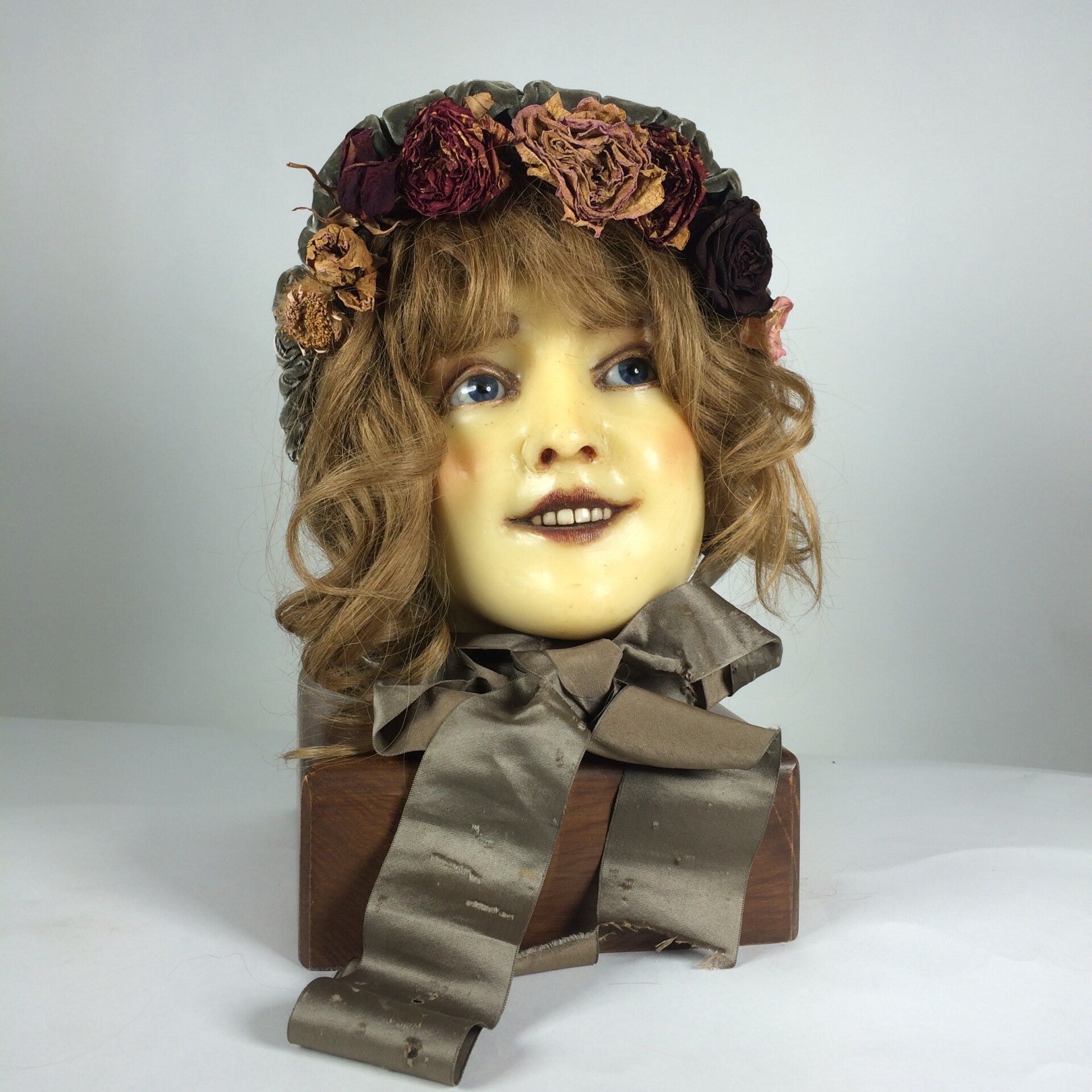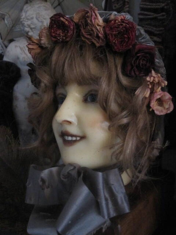 A very rare wax head, in very good condion. one of the first wax heads, she has real glass eyes and porcelain teeth.this is not a fashion model. she is mount on a still original heavy wooden oak base. it is a wig head. she wears a wig, the beautiful bonnet is included. in very good condition if you consider she is almost 120 years old.