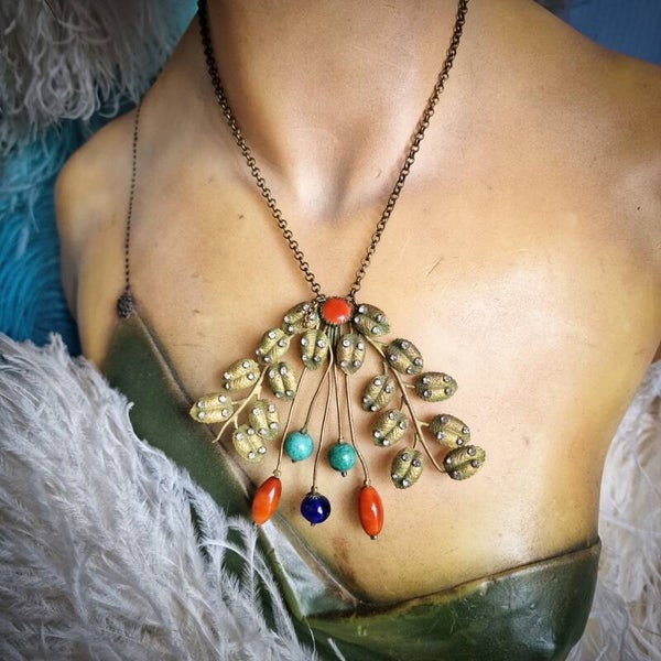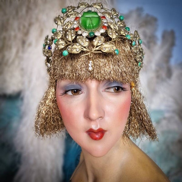 Step into the dazzling world of the Roaring Twenties with our enchanting Egyptian Revival Trio! This extraordinary headdress, bracelet, and necklace combo from the 1900s-1920s boasts the glitz and glamour that once adorned the iconic Sarah Bernhardt and Mata Hari. Picture yourself as a modern flapper, turning heads with a sublime, one-of-a-kind collector's headdress. Draped with loosely linked elements, it features a magnificent green scarab as its centerpiece, surrounded by gold leaves, rhinestones, and colorful stones.