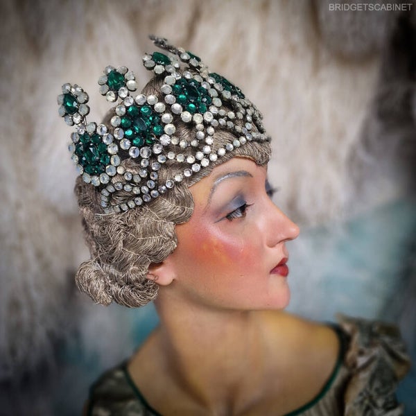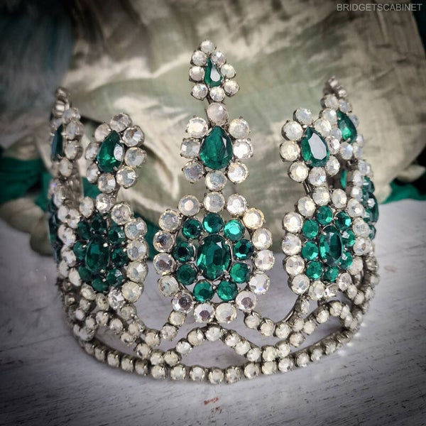 Step into the spotlight of history with this captivating vintage headdress, once a cherished part of the French Follies theater world. Its stunning shape, adorned with dazzling blank and green glass stones, exudes an unparalleled sense of elegance.
