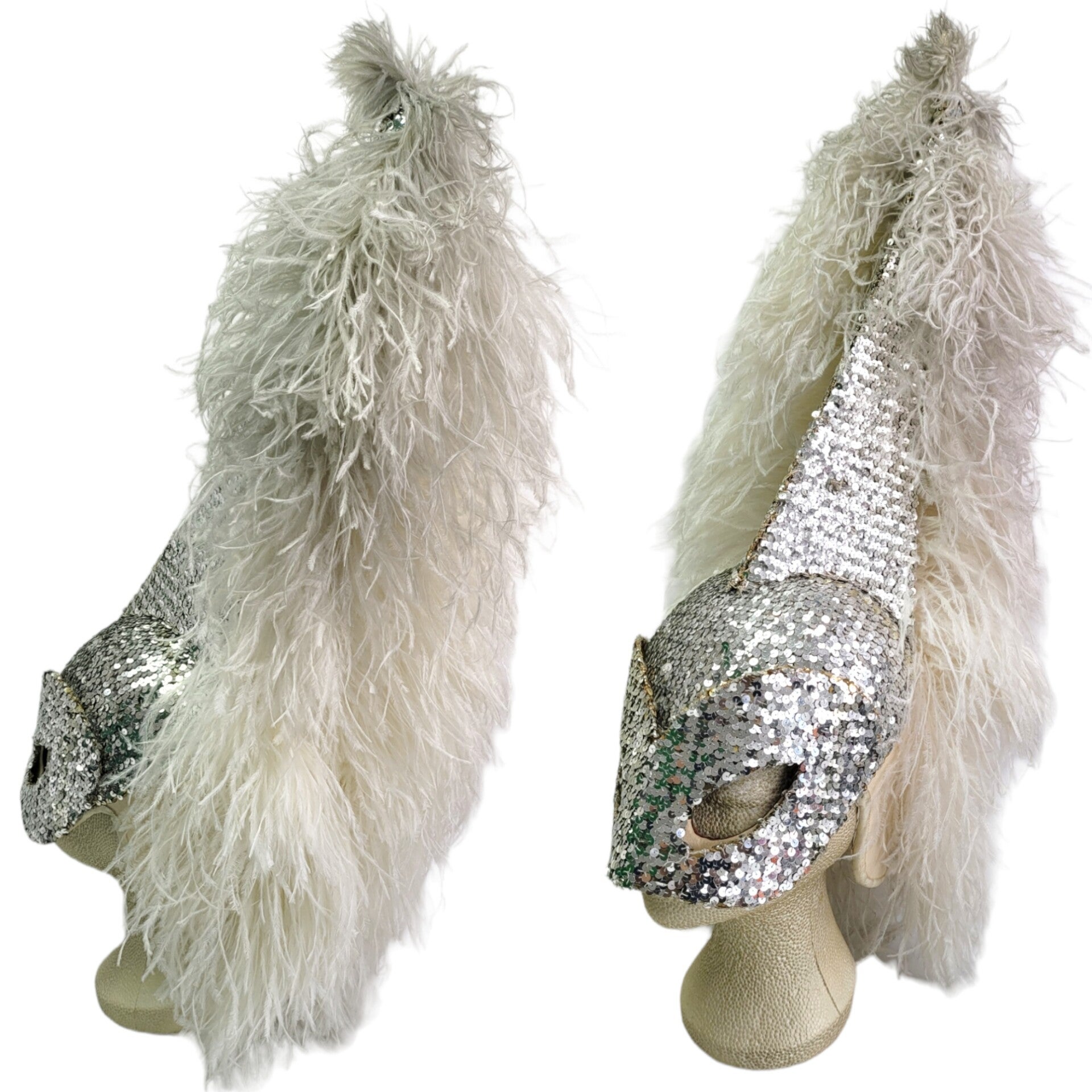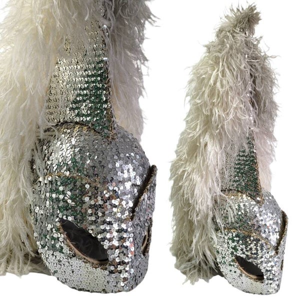 The headdress is shaped like a helmet-cap type with a point that goes up, there are cutouts for the eyes just like with a cat woman, this was very sexy which left some guesswork and a bit mysterious. The hat is studded with silver and gold-colored sequins which creates a lot of bling effect! At the back are antique feathers that give the headdress the finishing touch!, The headdress is ready to use for a dancer, photo shoots, or for decoration for the collector.