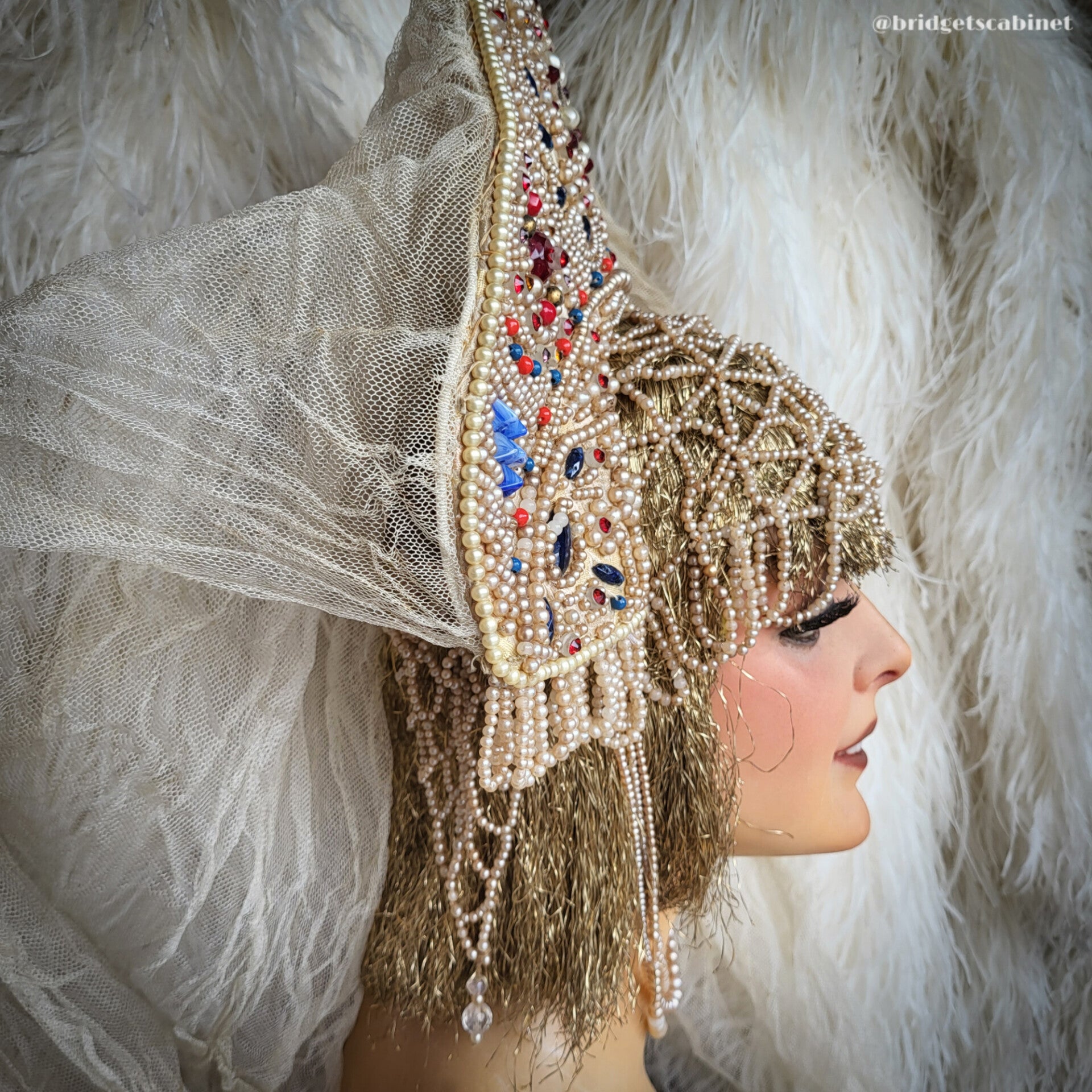 The item that we are selling is a very special and unusual antique Kokoshnik that is fully embroidered with antique hollow glass pearls and beautiful colored stones. Both in settings and patterns.