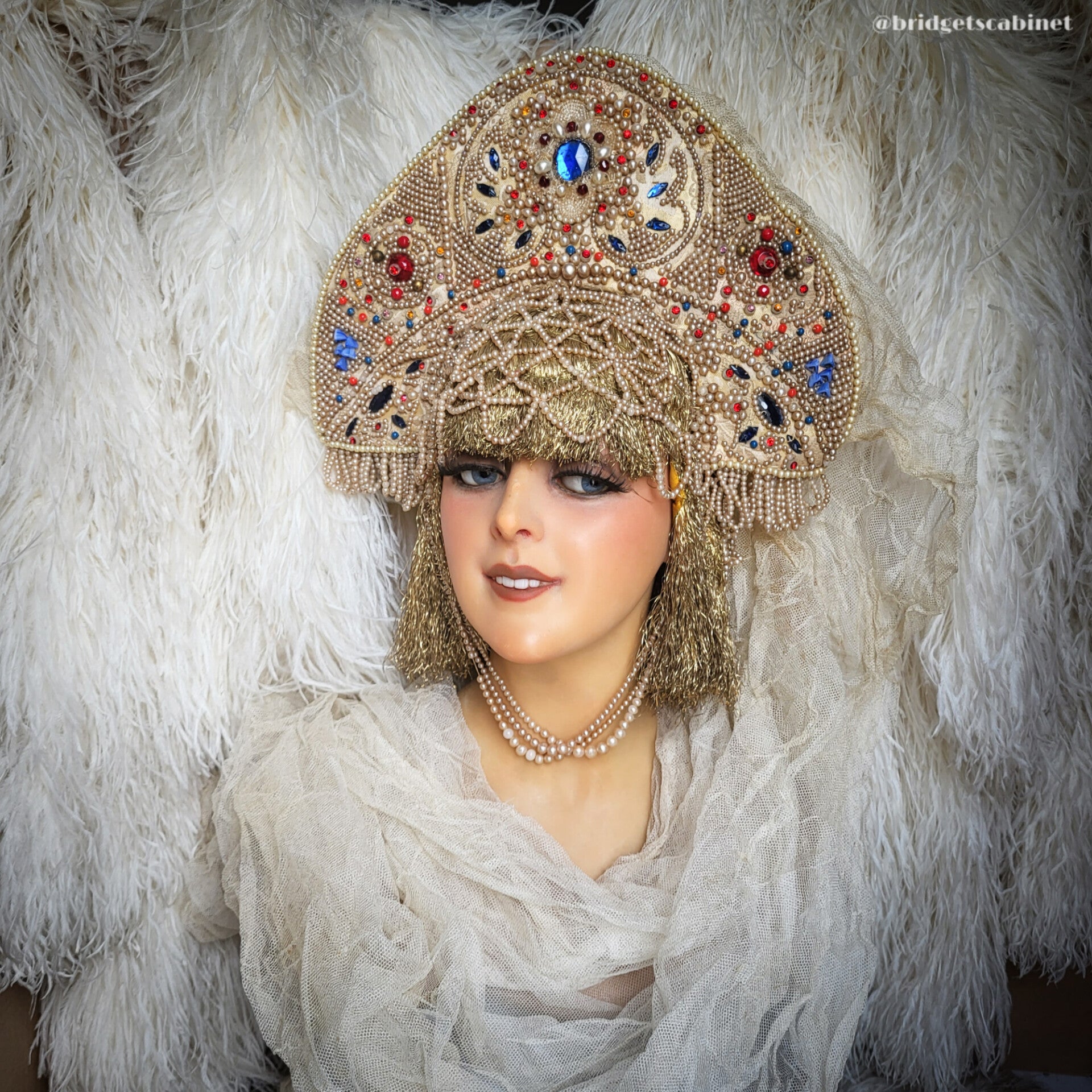 Despite being from the late 1800s and in good condition for its age, the Kokoshnik has a veil and some sort of elastic band that may have been replaced later, these headdresses were very exclusive and originally hard to find nowadays.