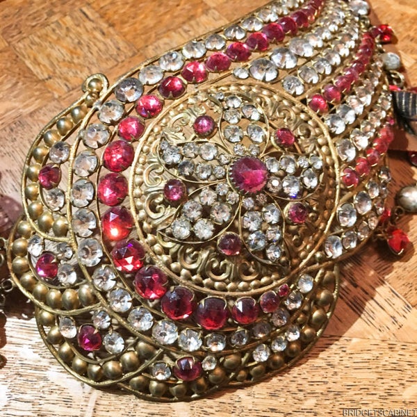 Bridget found this stunning Theater set from the early 1900's, one of the most beautiful items we ever found. the headdress and the bra are handmade from metal and and covered with a variety of ruby red and clear rhinestones.