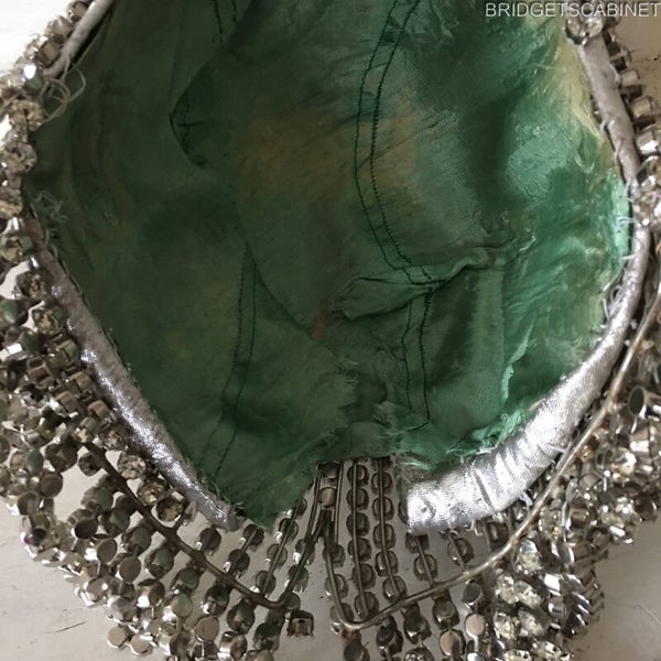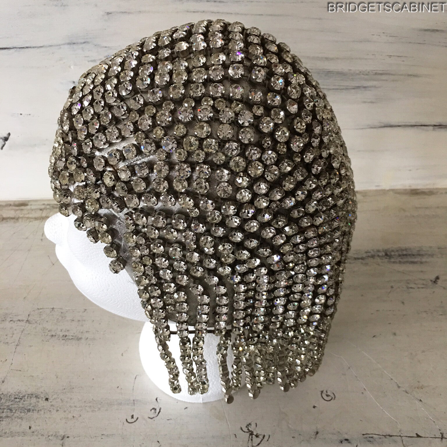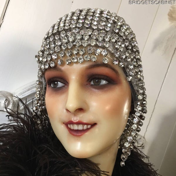 Bridget found this very unique 1920's Stage Rhinestone Headdress. this piece is stil in perfect condition. once used on the Parisian theaters as part of a costume. this hand-made headdress is covered with stunning sparkling rhinestones. the headdress is like a helmet with on the inside a soft silking lining.