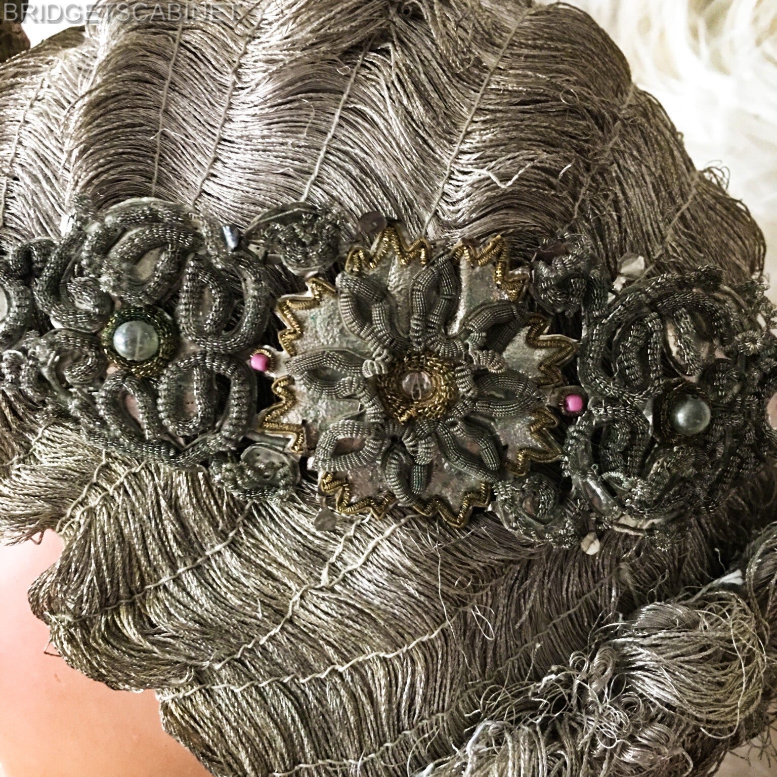 Bridget found this beautiful 1930's Embroidered Russian Stage Headdress. this very rare hand-crafted headdress has silver metal bullion threads and all kind of tiny beads in a floral pattern. if you look at the pictures you will notice all the beautiful details. it's a flapper styled headdress and has been used in the Parisian Theaters worn by a Russian Theater group, this comes straight from a theater's old stockroom.