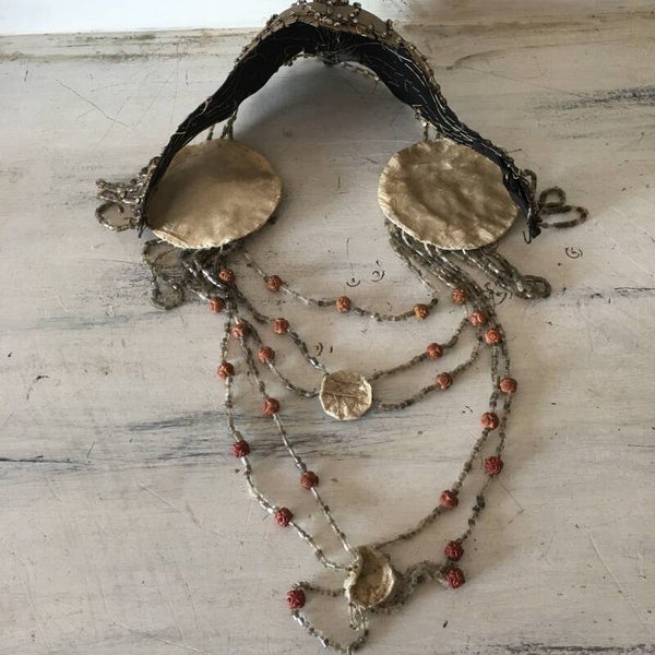 Bridget found this beautiful 1920's French stage theater headdress, a real stunning piece, still in really good condition, even still wearable. a very rare model with all kind of bone beads and different colors of rhinestones. a stunning piece from the roaring twenties in Paris.