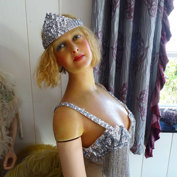 A beautiful antique French full-size wax mannequin made by the famous French maker P. Imans, she's from circa 1910-1920, these kinds of mannequins were used for showing clothing, hats, and jewelry collections in the exclusive, French "magasins." It's very hard to find these kinds of mannequins since many of them didn't survive time. She has real implanted human hair, stunning real glass eyes, and a beautiful expression on her face. She can take some poses because she has a kind of turnable upper body. The bust/head is made of wax, and the body of a mix of fabric and papier mache. the arms are made out of a kind of composite. You can dress her up or you can leave her as she is. She is still in very good condition and still in original condition, nothing has been modified or replaced, everything is still complete, and there are however some tiny parts of her fingers missing. A very rare find. Costume is not included only to give you an idea. If you still have some questions about this item, do not hesitate and drop me an email.