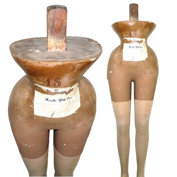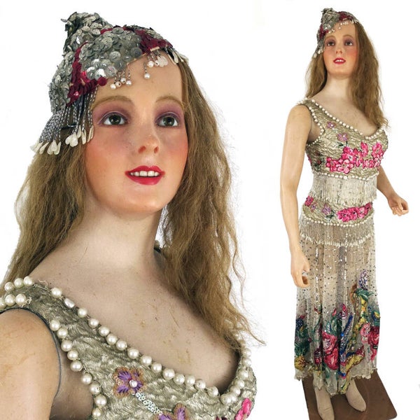 Bridget's Cabinet is proud to offer another very rare full-size custom-made wax mannequin. She was custom-made for a London Lady in 1906 by the Gems Studios in London. We got her from an English mansion owner who had her and some others for about 70 years. the mansion owners took her from her first owner, a lady from London who is also known by us. We have the mannequin's whole history. We even have pictures from her past where you can see her showing off beautiful clothing from the past. She has been on tour during the 1930's through England where she showed these beautiful costumes. After the tour the mansion owners took her and she has been used in exhibitions at the mansion ever since. For the last twenty years, she was carefully stored. As we are quite specialized in wax mannequins we have never seen this specially shaped mannequin, it has a beautiful wasp waist, it has besides a wax body/bust, and wax arms as well. Normally the arms are made of wood or a kind of composite. The arms can be moved into different positions since it has a solid metal mechanism. She has real implanted human hair and real glass eyes. She stands on a metal plate. She is still in excellent and original condition, nothing is missing except a piece of her thumb. the"underbody" is made out of a kind of papier mache. If you still have questions or requests, please don't hesitate and drop me an email!! You can still find wax busts but a full-size mannequin is very hard to find especially in good condition.