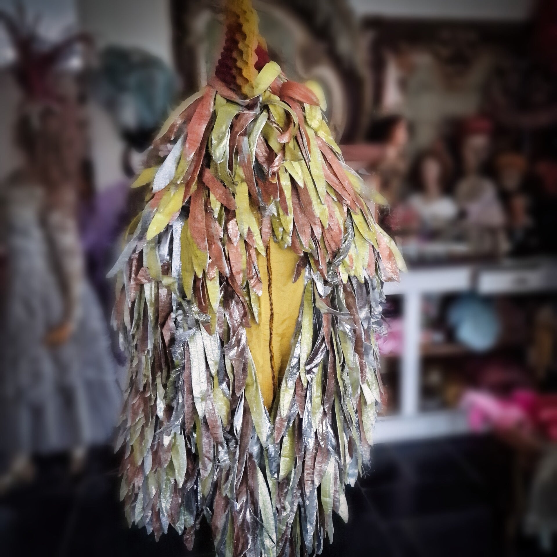 Discover an extraordinary and one-of-a-kind vintage theater costume, hailing from the enchanting world of French theater. This exceptional ensemble comprises two distinctive pieces: a captivating head mask and a single-piece costume with wing-like sleeves, intricately adorned with a plethora of meticulously crafted "feathers" in diverse fabrics.