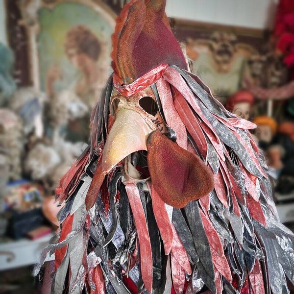 Discover an extraordinary and one-of-a-kind vintage theater costume, hailing from the enchanting world of French theater. This exceptional ensemble comprises two distinctive pieces: a captivating head mask and a single-piece costume with wing-like sleeves, intricately adorned with a plethora of meticulously crafted "feathers" in diverse fabrics.