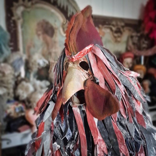 Immerse yourself in the allure of this finely made costume, showcasing a red zipper closure (likely replaced) for the one-piece garment. The mask, designed to be worn in two unique styles, exudes an air of mystery reminiscent of the plague doctors of yore. Whether worn with care or showcased as a mesmerizing decoration on a mannequin, this costume transcends its theatrical origins to become a versatile and timeless piece.
