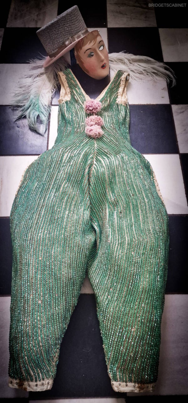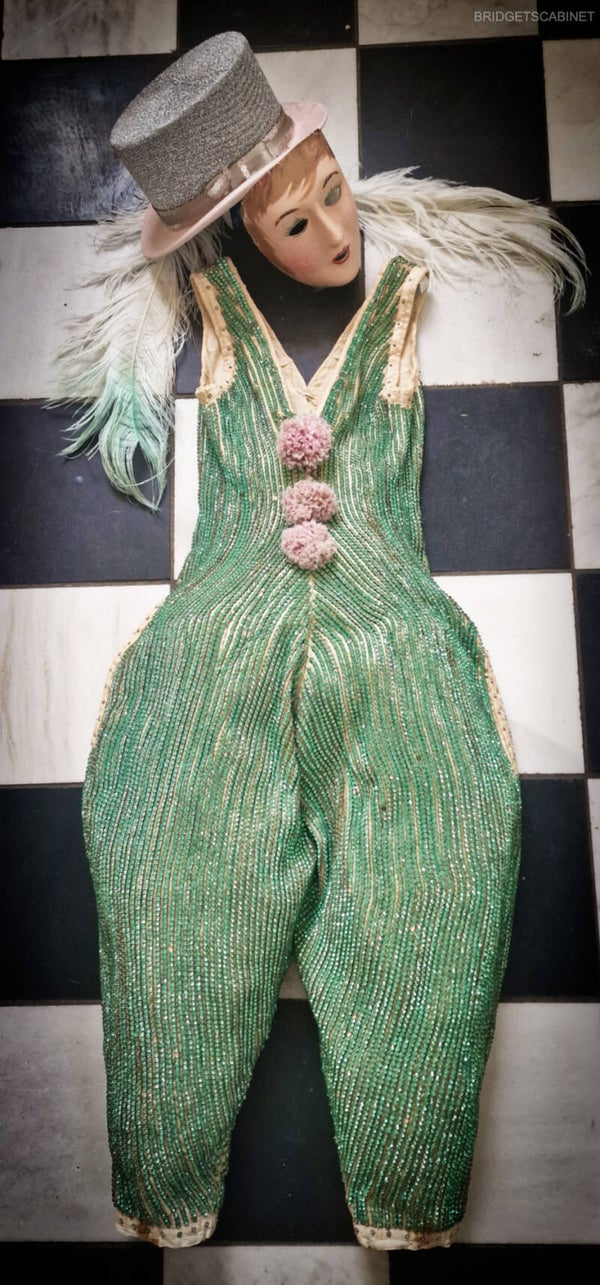 Introducing an extraordinary and unique piece - an antique clown costume from France, adorned with thousands of genuine glass rhinestones, each individually set by hand. As a collector and dealer, I have never encountered a costume like this.