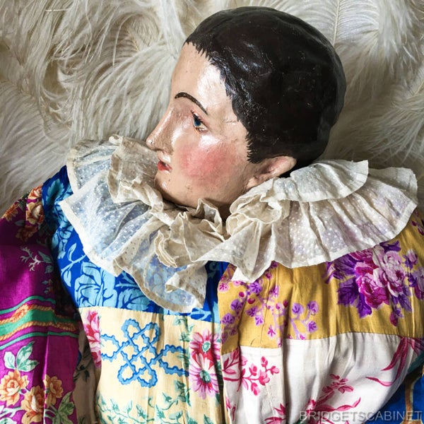 Bridget's Cabinet found this very cute 1930's French Pierrot clown costume. it's a child-sized costume. it is still in very condition considering its old age. the multi-coloured costume is made from a silky cotton fabric with many patterns and vivid colours finished with beautiful lace. the whole appearance makes this costume so lovely.