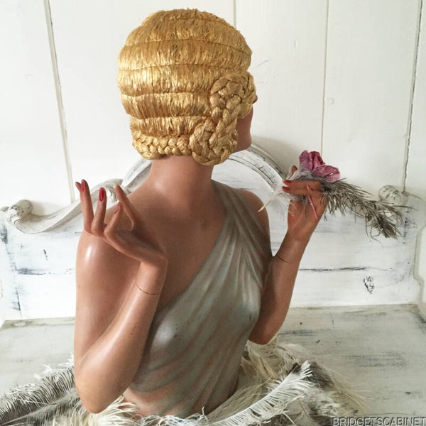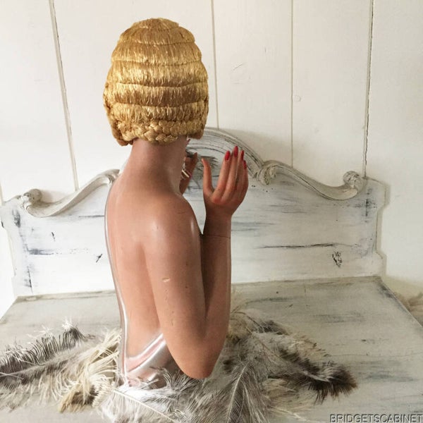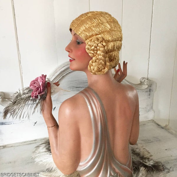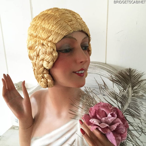 This is another very rare 1920s wig from a unique private collection from France we were able to obtain after many years, there aren't many left in the world today, you can either find them in museums or private collections. they were quite a hit in the Roaring Twenties. they are so rare, if you google these wigs you may find just a few of them in museums or past sales. One of the finest and most elegant wig cloches to be found, the wig is woven from very thin and fine sort of raffia threads into the classic hairdo of the 1920s Flapper period, complete with finger waves all over and pinned-up curls at the back and a mysterious curl on the forehead. What makes this evening wig extravagant is the black color and the 2 little foam ears. Can you imagine who did wear this wig once and what a lovely dress she must have had combined with this wig? A very rare treasure from the roaring Twenties in superb condition and even still wearable. it is woven on a silk/cotton cap. These kinds of wigs were hype during the 1920s, they became very popular and also well-known as a "bad hair day " wig. They came in many different versions but there aren't many left these days. you can find them only in private collections or museums. This wig is also coming from a private collection and is considered a beautiful treasure from the past, a real museum piece. If you have any more questions concerning this item, please don’t hesitate to ask and drop me an email!