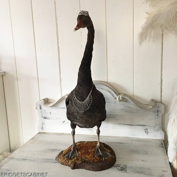 We found this beautiful antique back taxidermy swan with a collector in France, this item is still in very good condition and is in a standing pose. these items are quite hard to find and especially in this condition, we dressed it up a little to give you an idea how it can be in your interior.