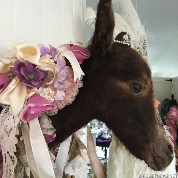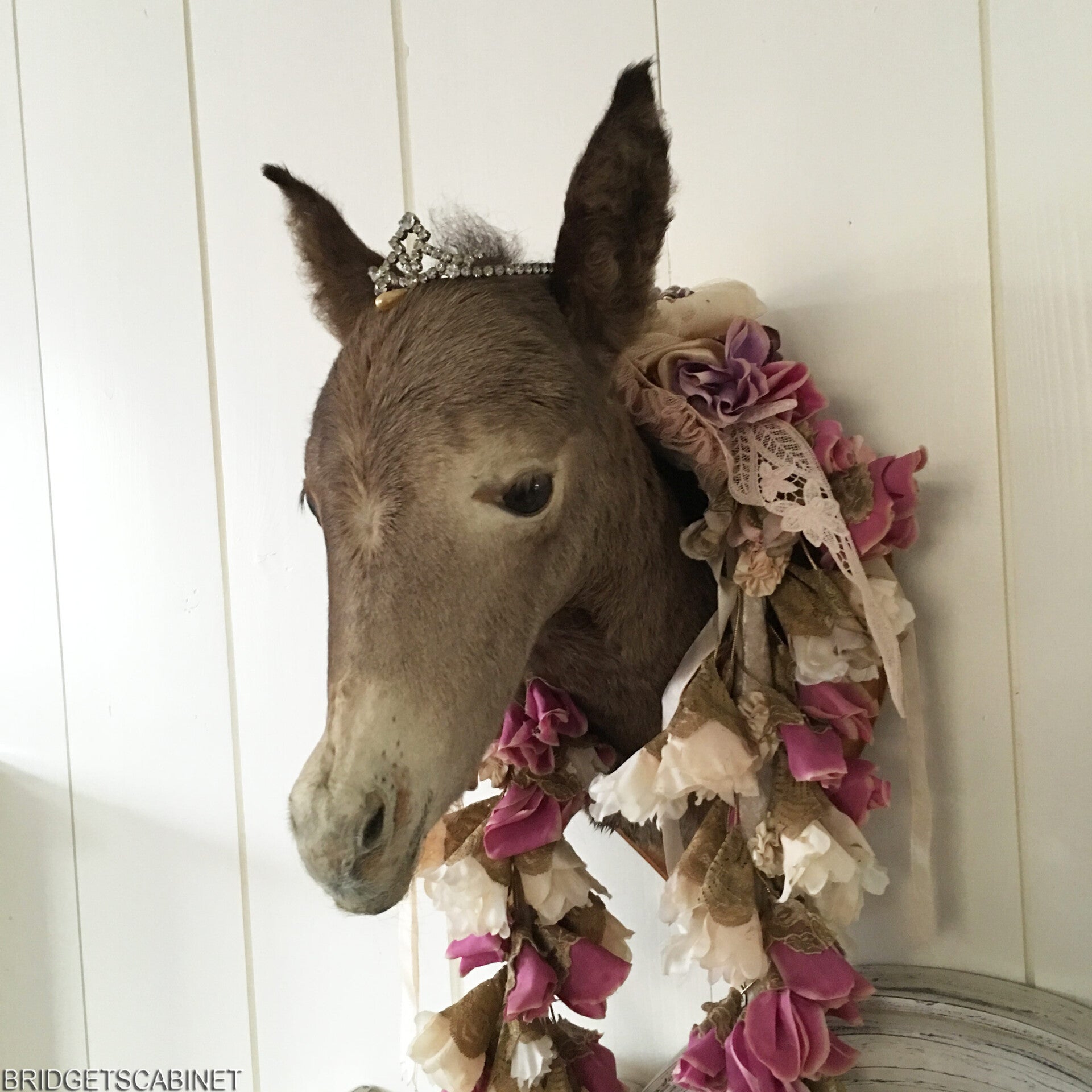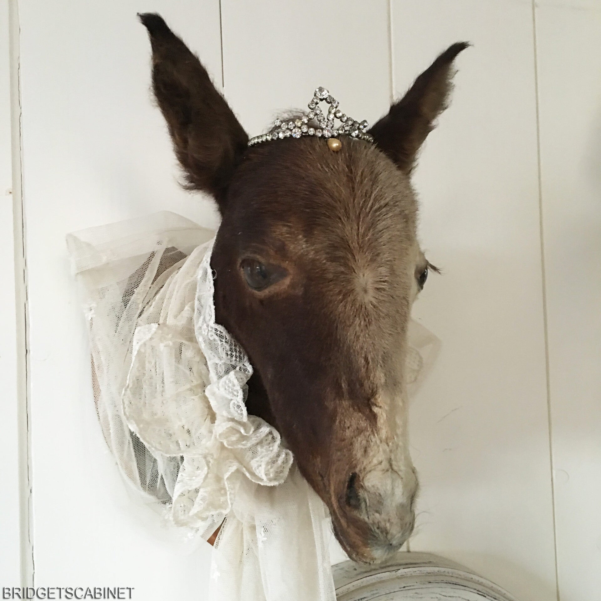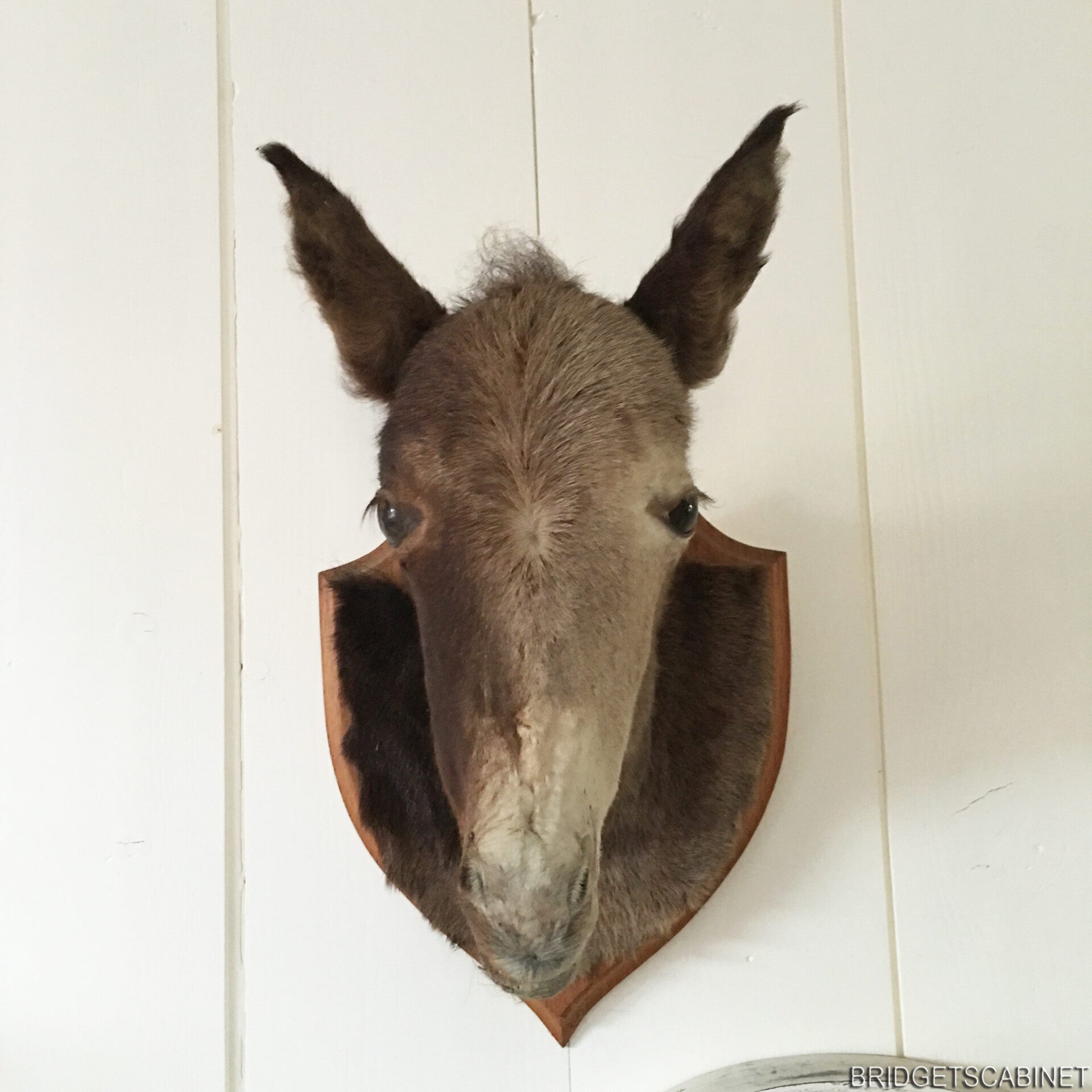 Hereby we offer this beautiful unbelievably rare vintage Taxidermy Mule Foal, A mule is the offspring of a male donkey (jack) and a female horse (mare). it is still in perfect condition considering his age, it has a beautiful perfect brown fur on one site and grey on the other, an enchanting face, it is mounted on wooden back plate. it's very odd to see that one side of the mule is dark brown colored as an horse and the other side it is grey as a donkey. very detailed like eyelashes and whiskers still present.