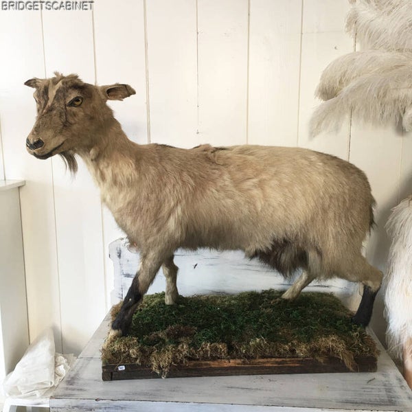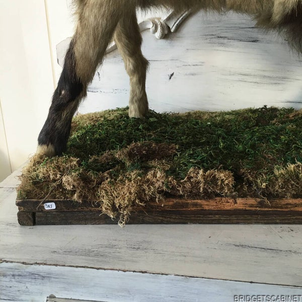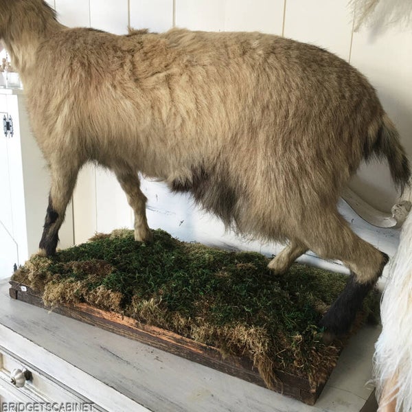 We offer this very rare and beautiful taxidermy goat from the 1930's. despite its age it it still in really perfect shape, at the same time you notice the charm of its age. the taxidermy's craftsmanship from those days is really unique and stunning. it is firmly mounted on the original wooden base, actually it's a wooden floor covered with moss. it is a large goat. its length is about 43.30 inches.