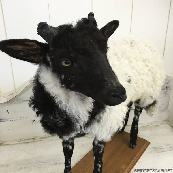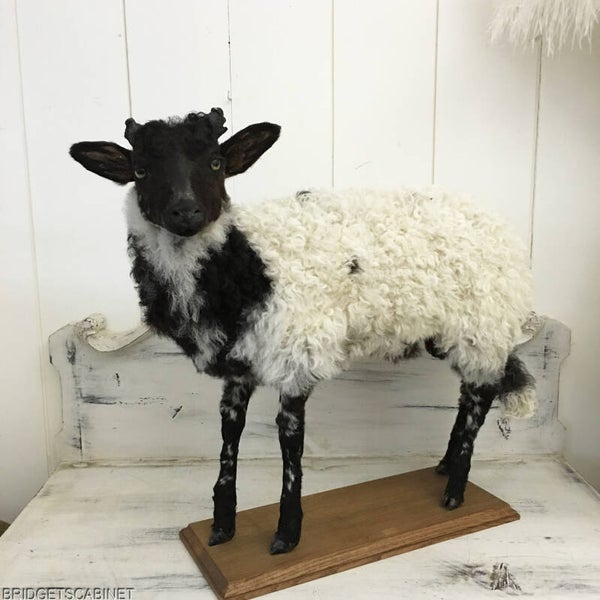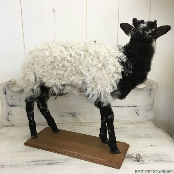 This one I had never seen before, such a beauty, it is from the 1930s, this full mounted Taxidermy sheep a mini sheep you can call it. beautiful black face, black and white curly fur. it is firmly standing on a heavy oak wooden base. the condition is really perfect.