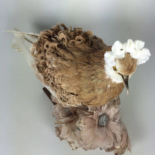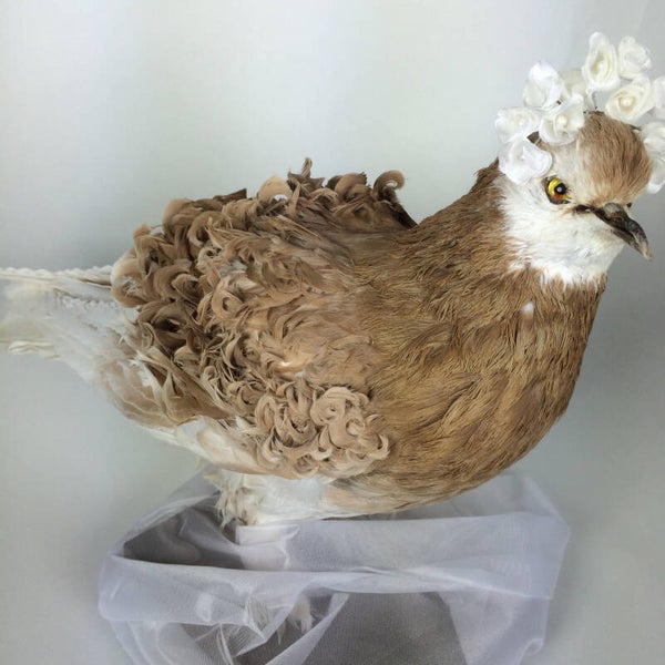 A stunning rare breed vintage taxidermy dove, it has all these beautiful curls on the back. The flower crown is also included.