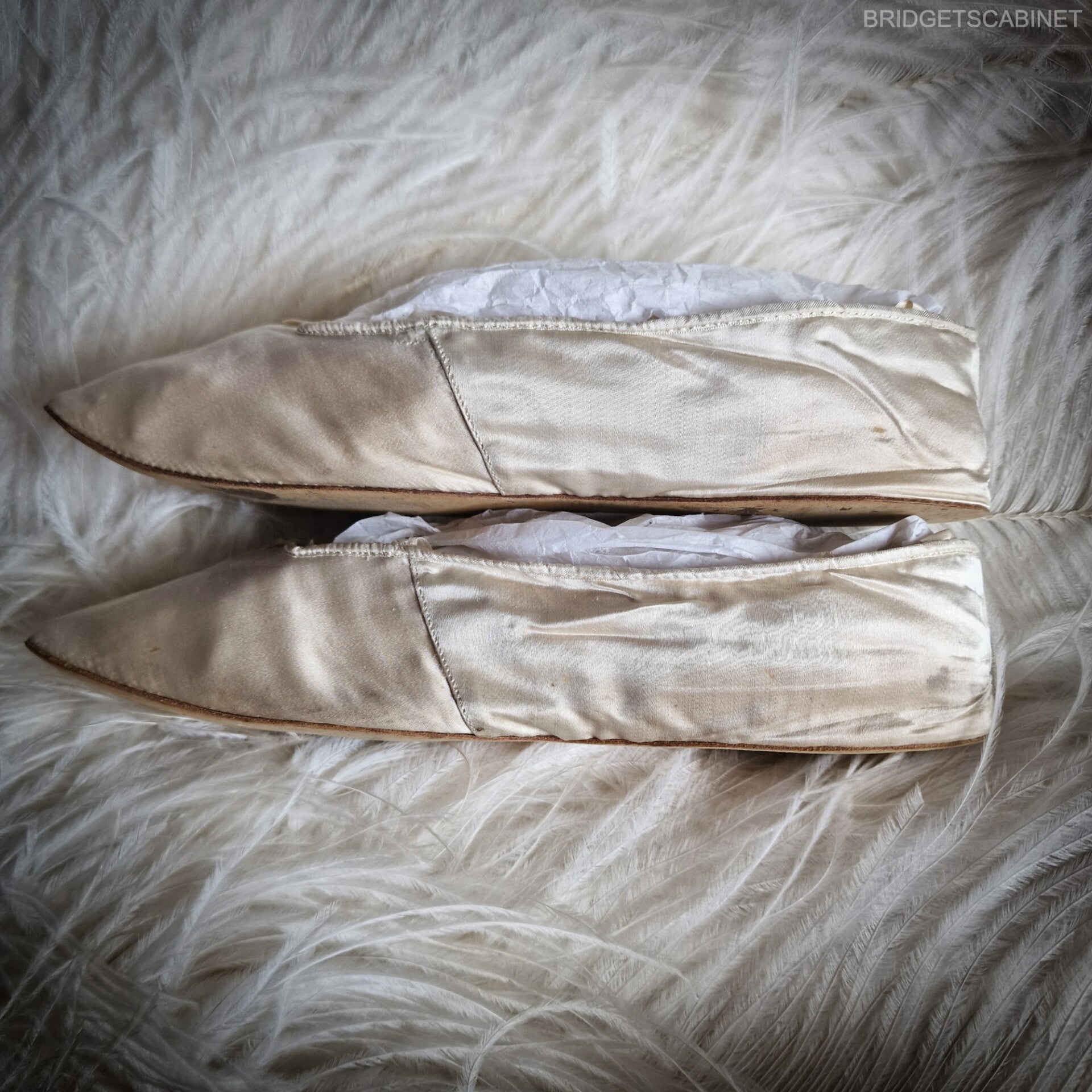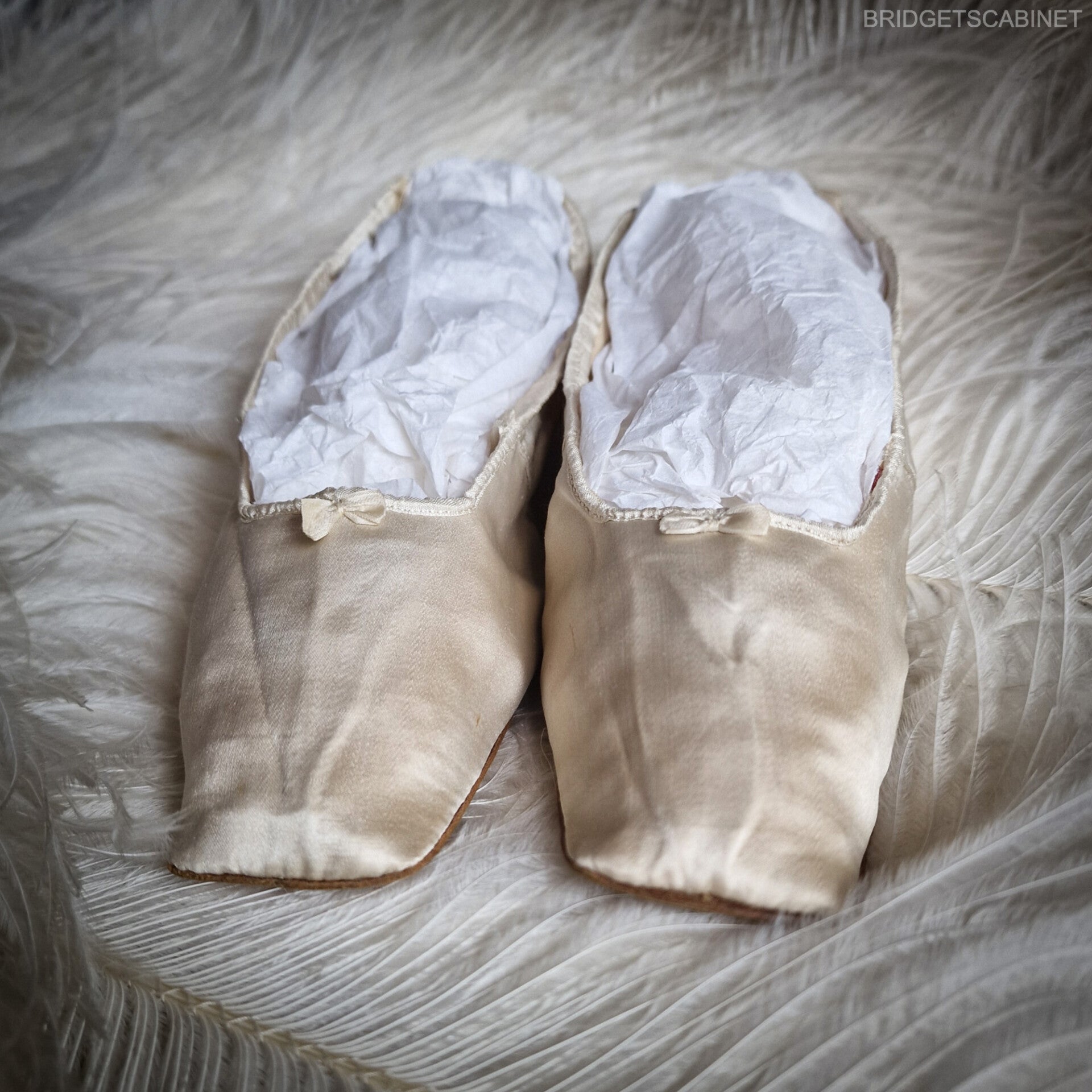 Step back in time with this stunning pair of 1840 antique silk satin wedding shoes. These ivory-colored treasures feature dainty bows, exuding timeless elegance. While one ribbon is missing, it adds a unique touch without detracting from its beauty. These well-preserved shoes, likely only worn on a special day, are in remarkable condition, as evident in the detailed photos.