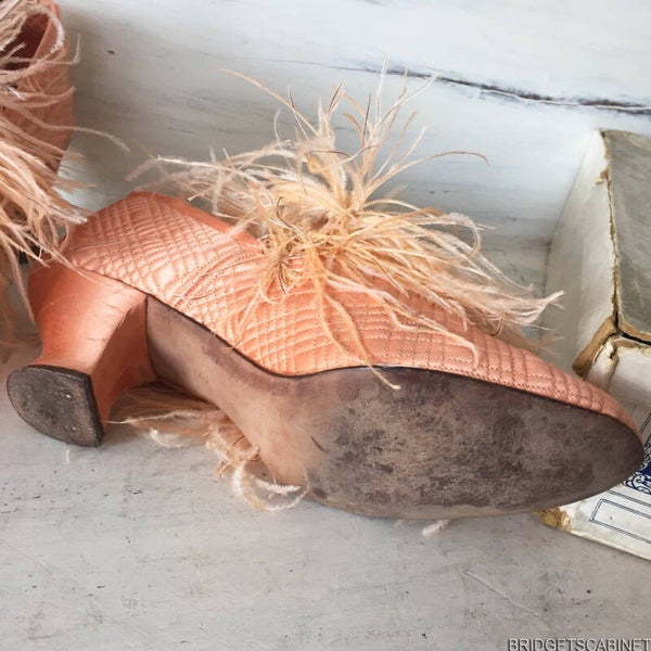 An amazing pair of 1920's flapper boudoir shoes with beautiful fluffy feathers in a peach color. there is a stitched pattern on the shoes, this pair is still in very good condition although there is some loose fabric on 1 heel as you can see on the pics but the fabrics is still very strong. a real unique pair of shoes, the shoes come with the original box. i will also list a matching boudoir coat of the same color and matching fluffy feathers. a stunning combination.