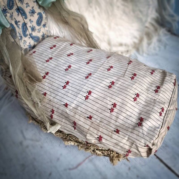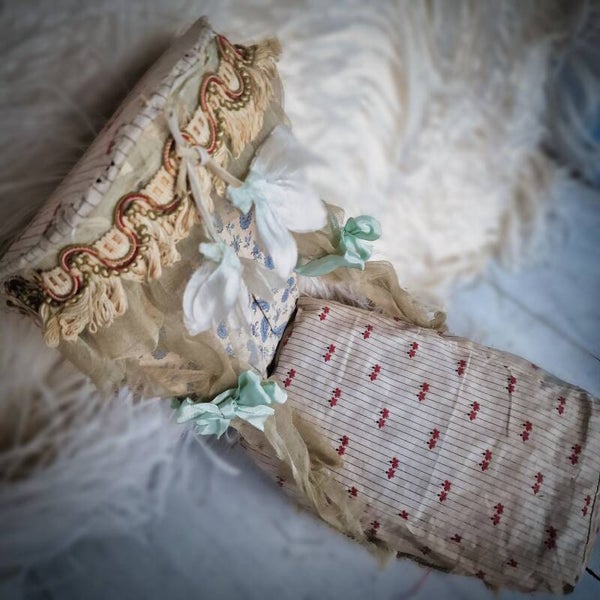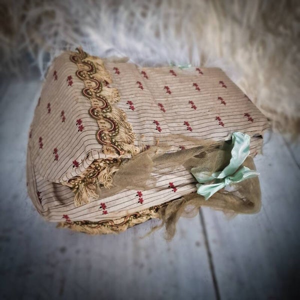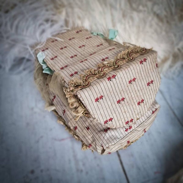 What sets this doll bed apart is its foldable canopy, a feature that adds a whimsical flair. Crafted from antique fabrics with delicate cardboard and ribbon accents, the canopy can be elegantly folded down. Despite bearing signs of age and use from its playful past, this Marie Antoinette-style doll bed emanates a timeless charm.