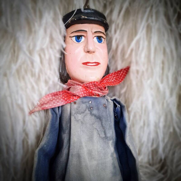 Embrace the allure of yesteryear with this captivating vintage wooden puppet doll from the grand Guignol Street theaters of a bygone era. Meticulously hand-carved with exquisite details that breathe life into its form, the puppet retains its original paint and is adorned in attire that embodies the character. Ideal for interior decoration and the discerning theater memorabilia collector, this puppet stands at approximately 30.7 inches in length, with the puppet itself measuring 20.86 inches. It is a timeless piece that adds character and sophistication to any space