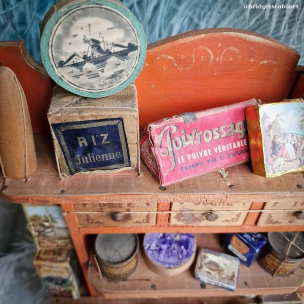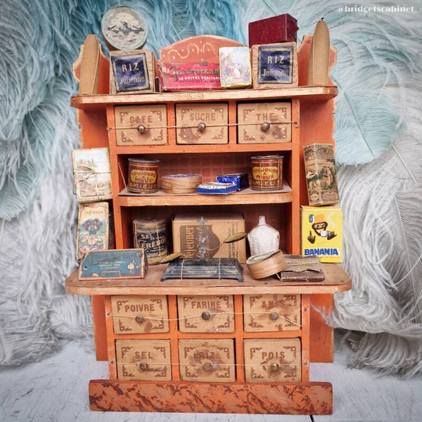 Discover the magic of childhood with this stunning antique French Epicerie toy. This gorgeous grocery store has never been played with and is filled with beautiful miniatures and unique boxes, all still attached with their original tiny threads. The antique apricot color and gold-bronze finish add to the charm of this vintage toy.