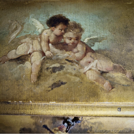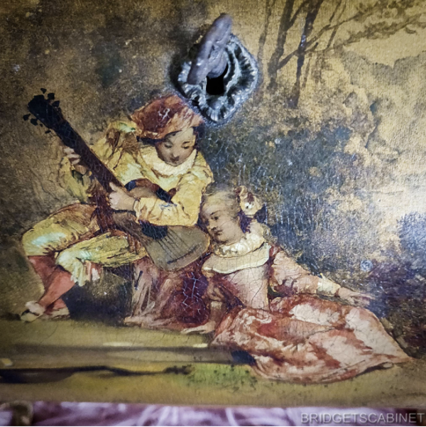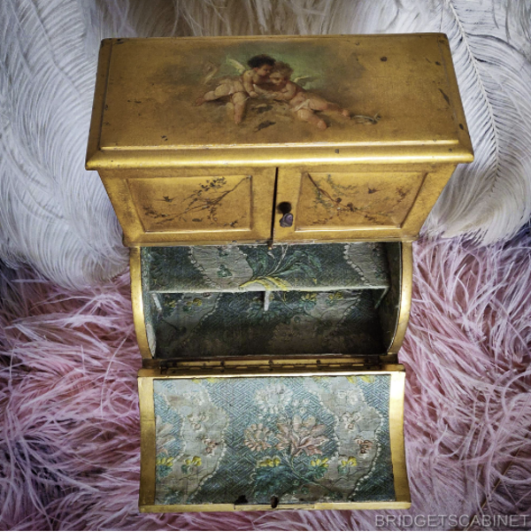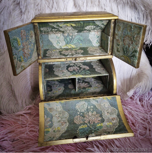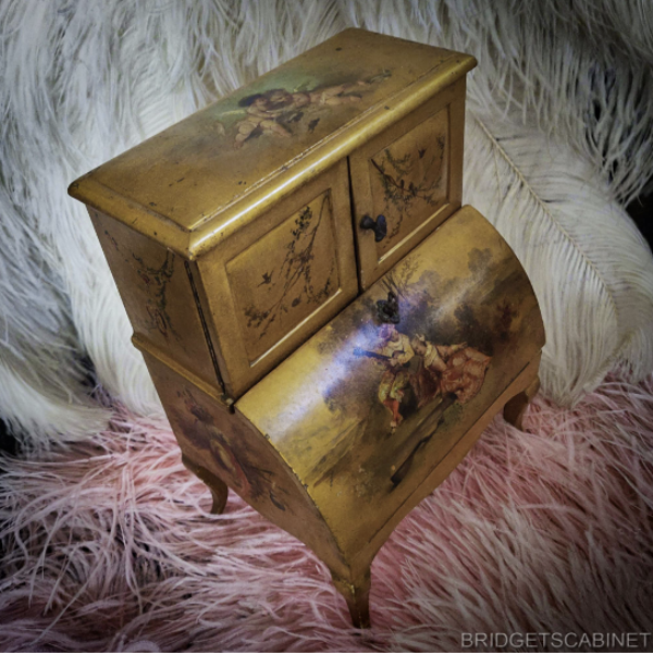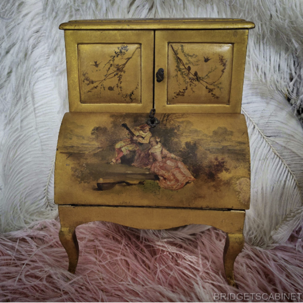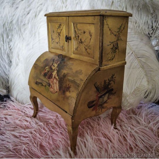 Bridget found this stunning and rare French miniature 19th-century display desk cabinet. the hand-painted sceneries are just fabulous. every side of this museum piece has a different romantic scene. on the inside you will find the original beautiful silk which is still in very good condition. Also the original key is still there. the itself doesn't work at the moment but this can be solved quickly.