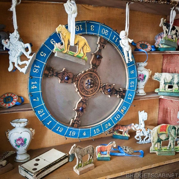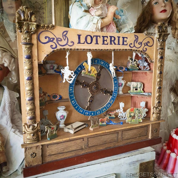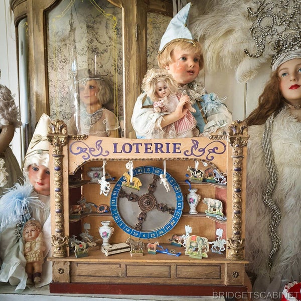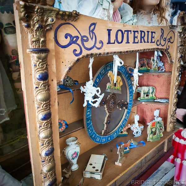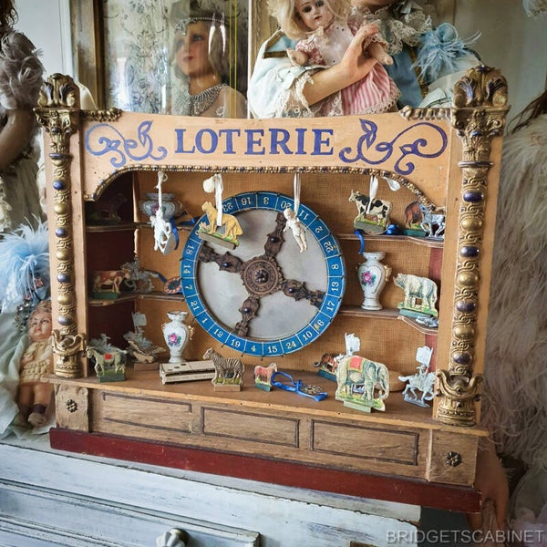 Bridget's Cabinet found this beautiful 19th. Century french children's or doll's Loterie game this is a real collector's item. the lottery game has still its original colours: Brown, Cream, Blue and Gold. the beautiful ornaments gives the Loterie that lovely appearance. this Loterie is still in great condition it's filled with little prizes. which could be won if you were playing the game. as said the loterie is still in good condition considering there has been paid with in the past