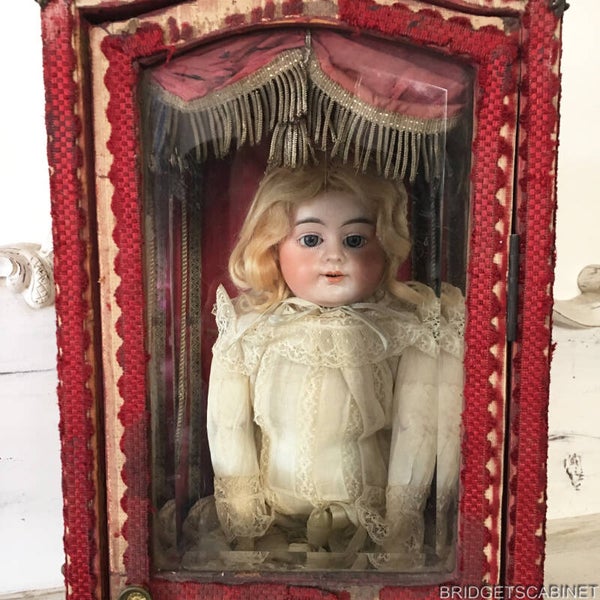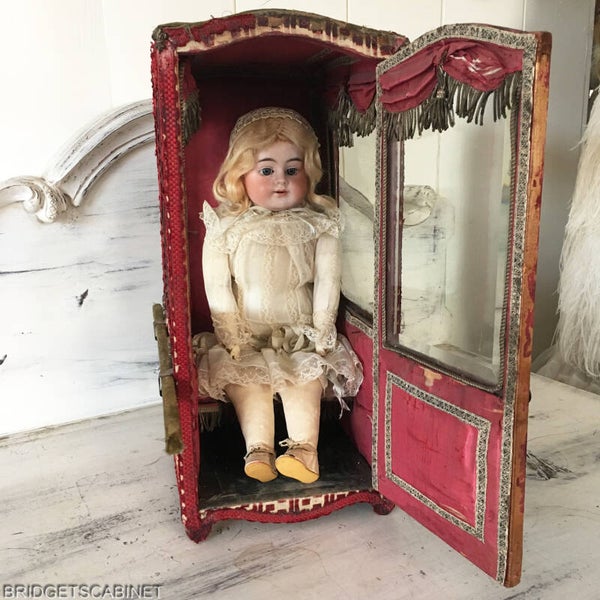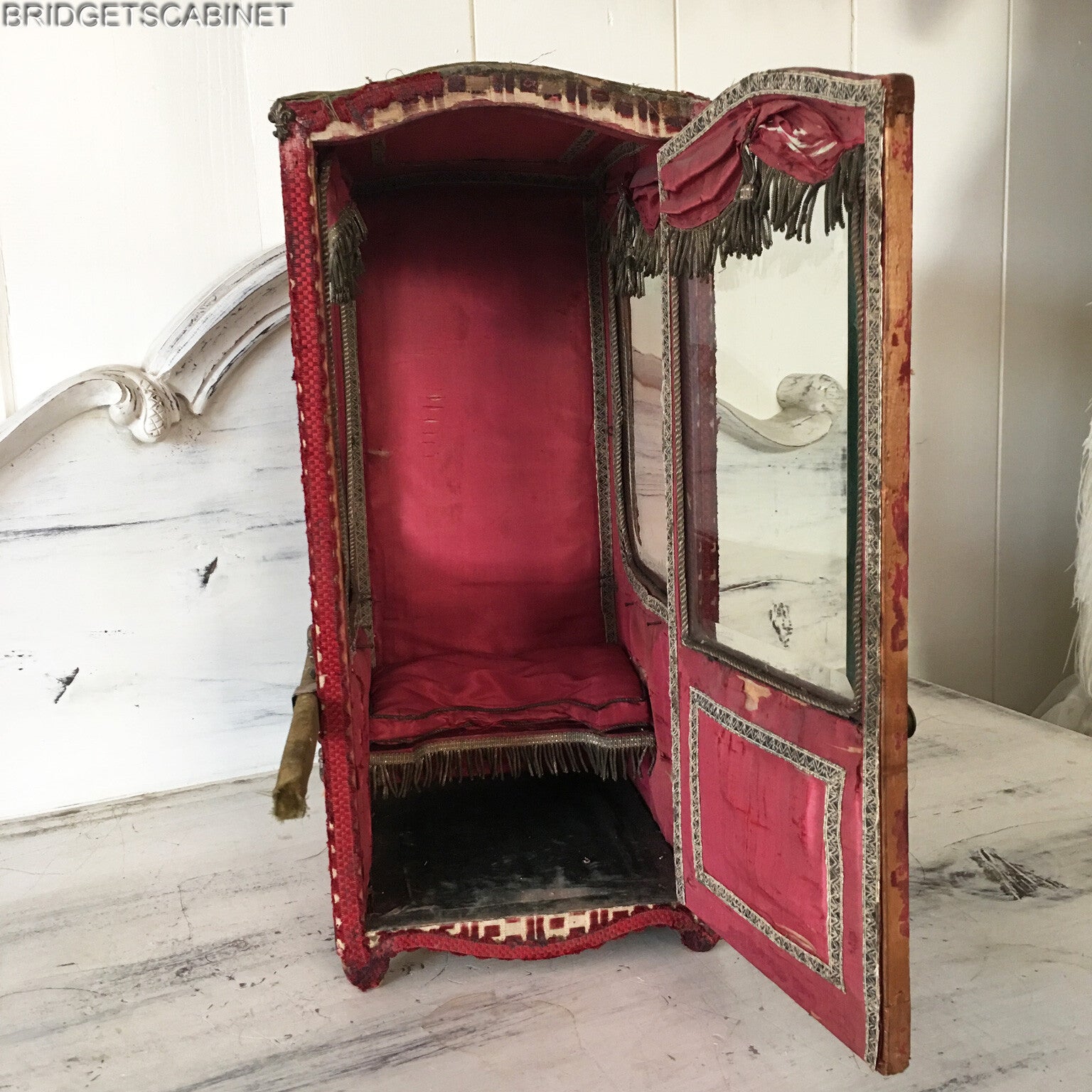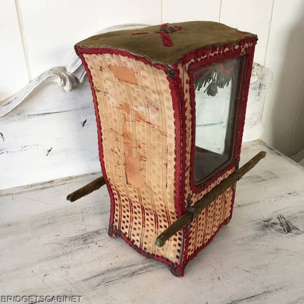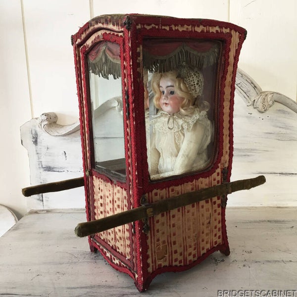 Bridget's found this amazing late 19th. Century large French doll sedan chair, it is a very unique one because of its large size, we had some of these sedan chairs in the past but they were all much smaller. this one will fit a large doll.