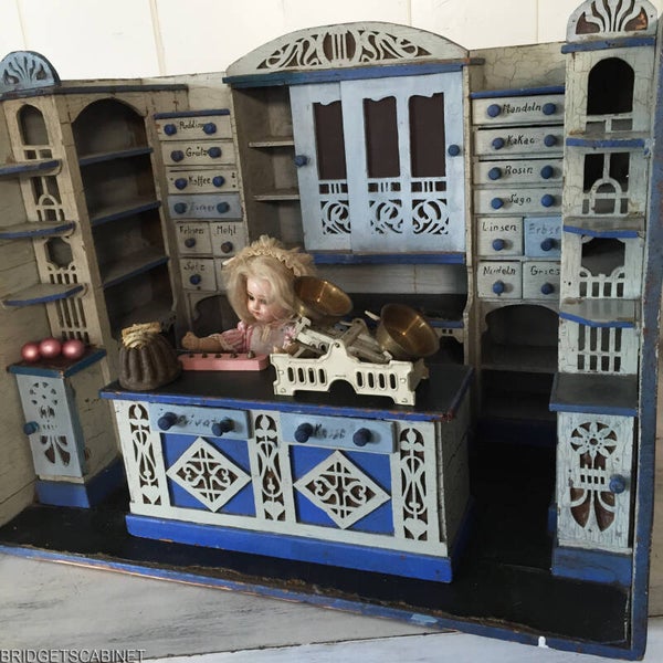 A beautiful large antique German doll-shop in different shade of Blue. It is a Large model, so you will be able to displaying your dolls in it. the Shop is filled with all kind of shelves, drawers and has a beautiful counter, the counter is removable. the shop has beautiful detailed carving, real craftsmanship. The doll-shop is still in good condition, certainly for its age. the paint is cracked but that give the shop its charming appearance. the accessories and the doll are not included. fill this shop with your own accessories, flower, fabrics to give it a personal touch. this is an unique piece of the past. If you would like to have more details or you have any other questions, please do not hesitate and mail me!!