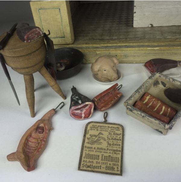 Rare German Gottschalk 1890/1900 butcher shop a big one and very rare to find these days. There is a loose standing counter piece in the middle, the walls have their original wallpapers and paints. The sausages hanging on the iron rack's beautifully detailed. In the back you have a counter with a shelf, all the meat you can take off and put somewhere else what you prefer, every piece is beautiful hand-made, and very realistic. The paint is the original color and no damage whatsoever to this shop. The man behind the counter is not originally from this shop. It is possible to ship worldwide, this is a once of a lifetime opportunity to find such a rare one like this one, at auctions they are very expensive if you still able to find them these days... Just look at these pics and let you take away to early times.... sizes deep 15,35 high 18,11 width 19,29 In very good original condition