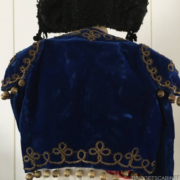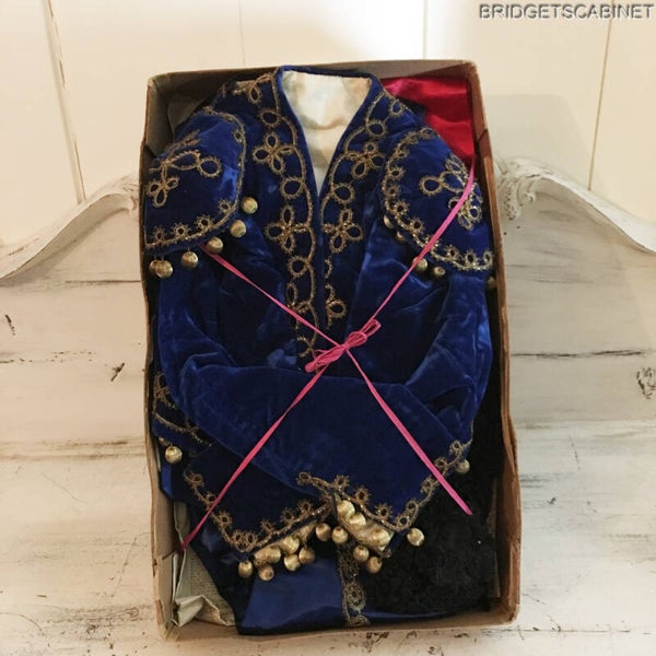 Bridget's Cabinet found this stunning 1920's Child Matador costume made out of a beautiful blue velvet fabric with silk and gold metal threaded embroidery and little gold threaded balls. it is a 4 pieces costume with hat, it is still in its original gift box with original old newspaper used as wrapping material, we unpacked it for the pictures but wrapped it again how it was saved for many many years.