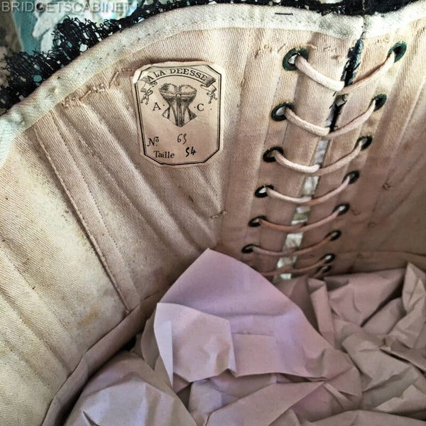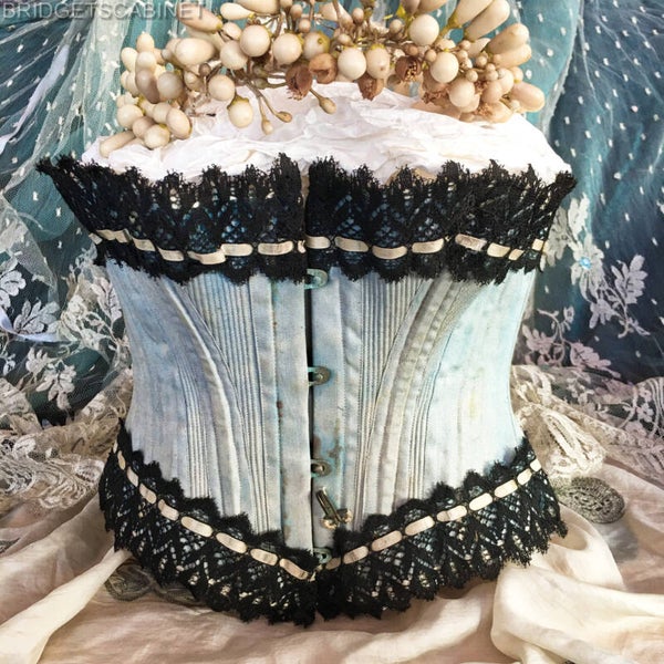 Bridget's Cabinet found this beautiful French baby blue colored corset. it still has its original tags inside. it cam out of an unused antique stock.