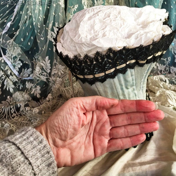 It is a very small wasp waist corset with still the original laces. On top and bottom the corset is accessorized with black lace which is accessorized with a cream colored ribbon,
