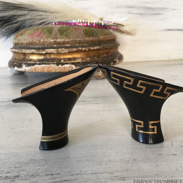 A beautiful rare pair of heels for 1920's flapper shoes. we got these heels from the heir of a shoemaker, there is also a nice story behind these heels. these heels were once ordered for a lady customer who had the oldest profession in the world sort of speak. because she haddpainful and difficult feet, the shoemaker always made various pairs of shoes which he decorated with these designer heels, he had different pairs of these luxurious designer heels in stock. this lady had her shoes made by the shoe maker and she could choose out of different pairs of heels and the shoemaker put the heels under a pair of comfy shoes specially made for her. the daughter of the shoemaker inherited all his stuff and because she was always enchanted by these heels when she was a child, she kept these heels all this time, in the meantime she is also aged and after all these years she decided to offer the heels to me. Anyway I was able to get 2 pairs of these amazing heels. both of them are listd, this is one of them.