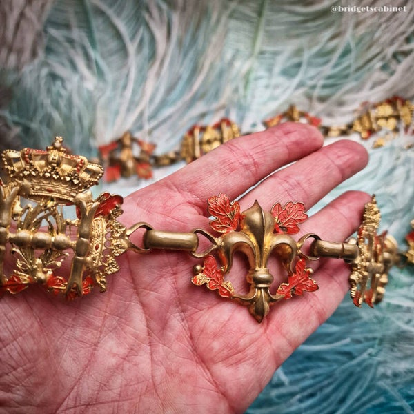 The necklace/belt is crafted from fire-gilt gold-colored material with orange tones and features intricate fleurs de Lys and crown designs. It is a true conversation starter and a must-have for any lover of vintage theater or fashion.
