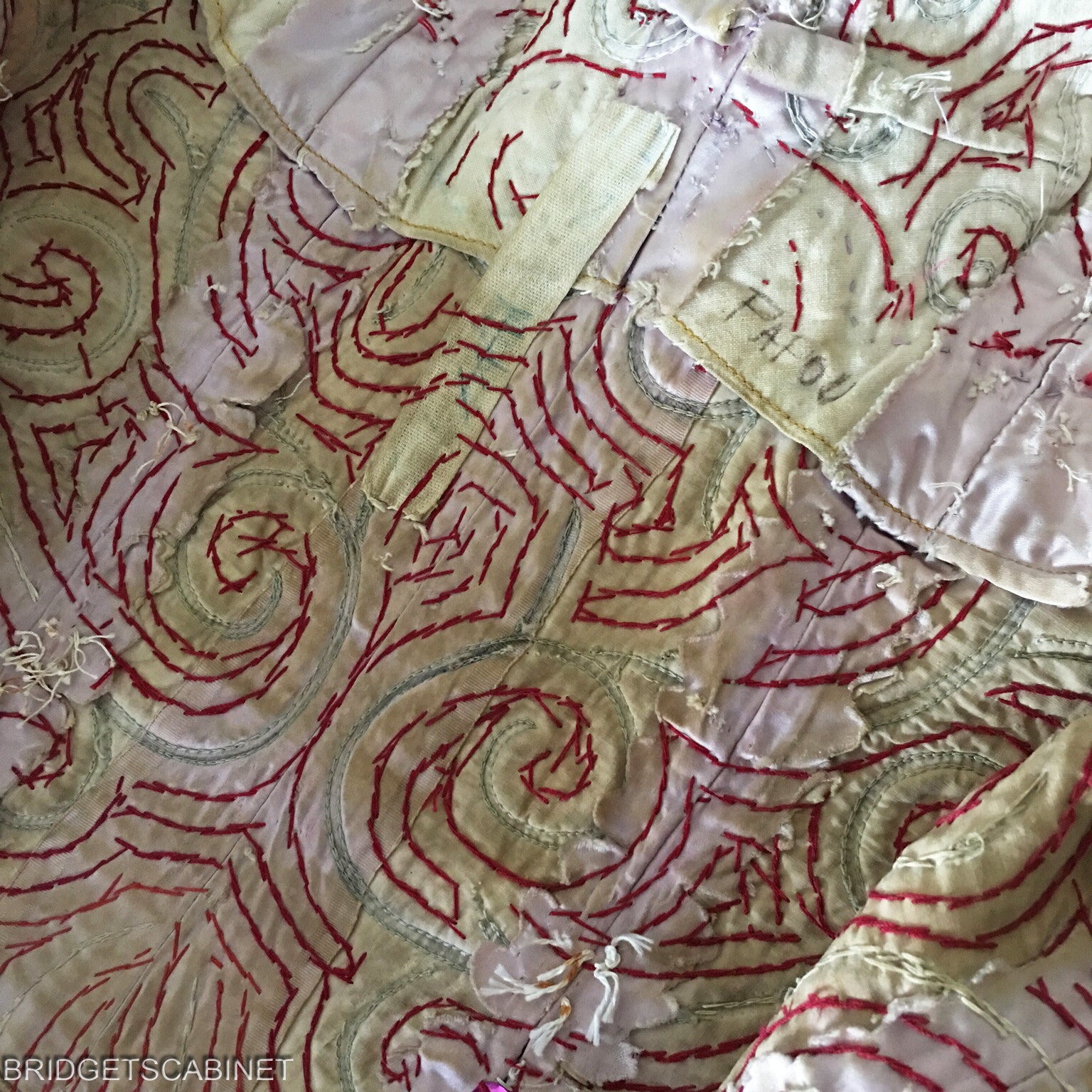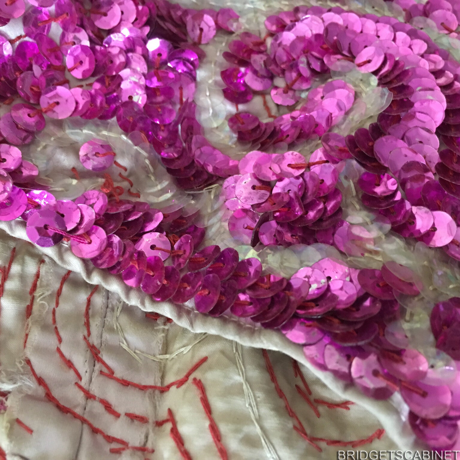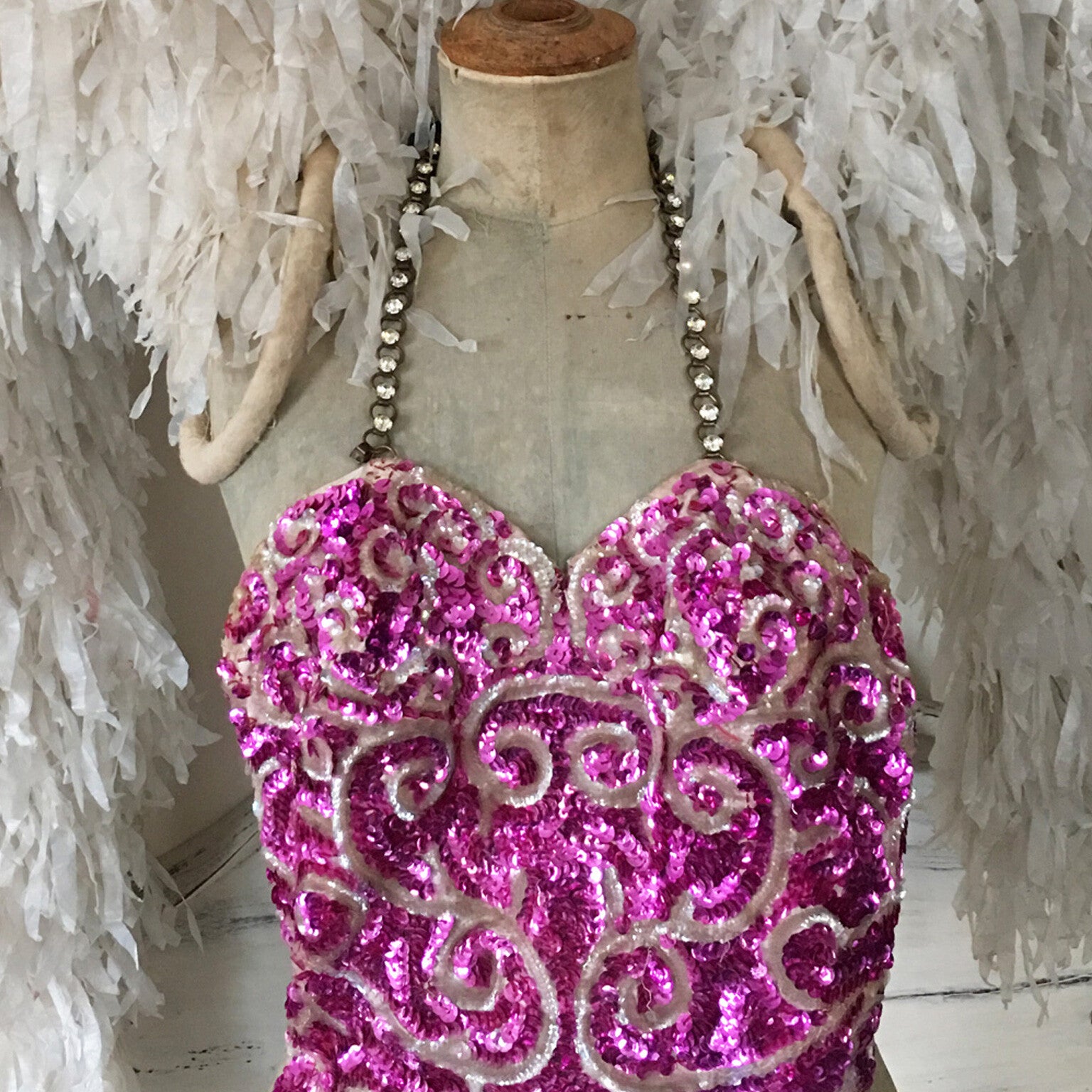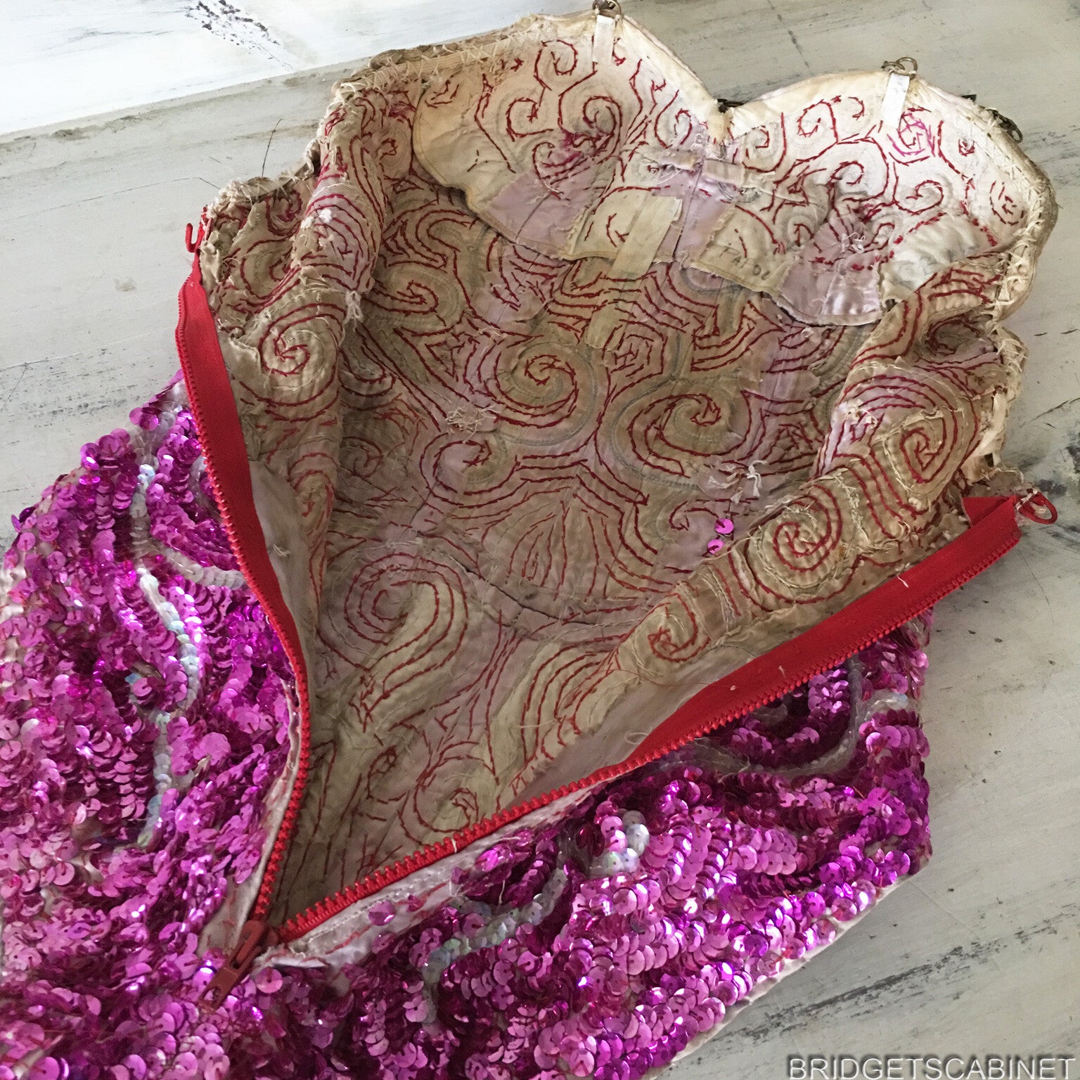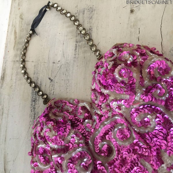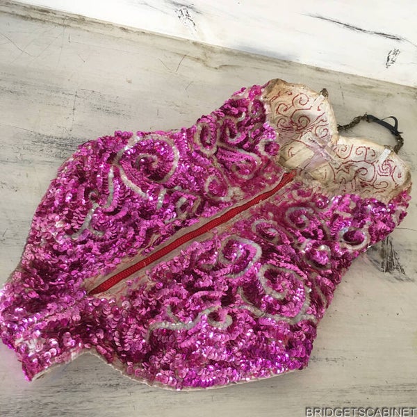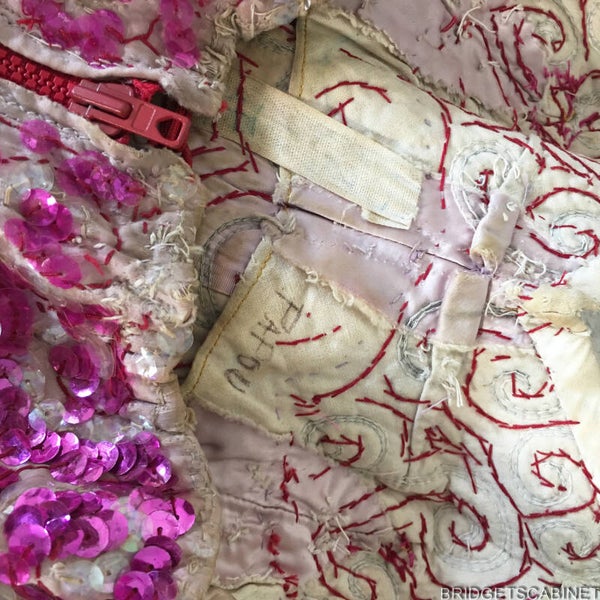 Bridget's Cabinet was able to get its hands to some original stage items from the Parisian theater Folies Bergerès , these items come from the collection of a former director of the famous French Folies Bergeres Theater from Paris. One of these items is this stunning handmade 1950's Dance costume, once used in a show in the Folie Bergerès, despite it has been used during all these performances , this dress is still in very good condition. A very colorful eye-catching item this is. Stunning sequin patterns all over and a shiny rhinestone chain. it must have taken a real long time to fabricate this stunning piece by hand, on the inside you see all the hand-stitched sequin patterns and you can also find the name of the performer. This is a real opportunity for collectors of old theater and stage costumes because these treasures come straight from the private collection of a former Folie Bergeres director.
