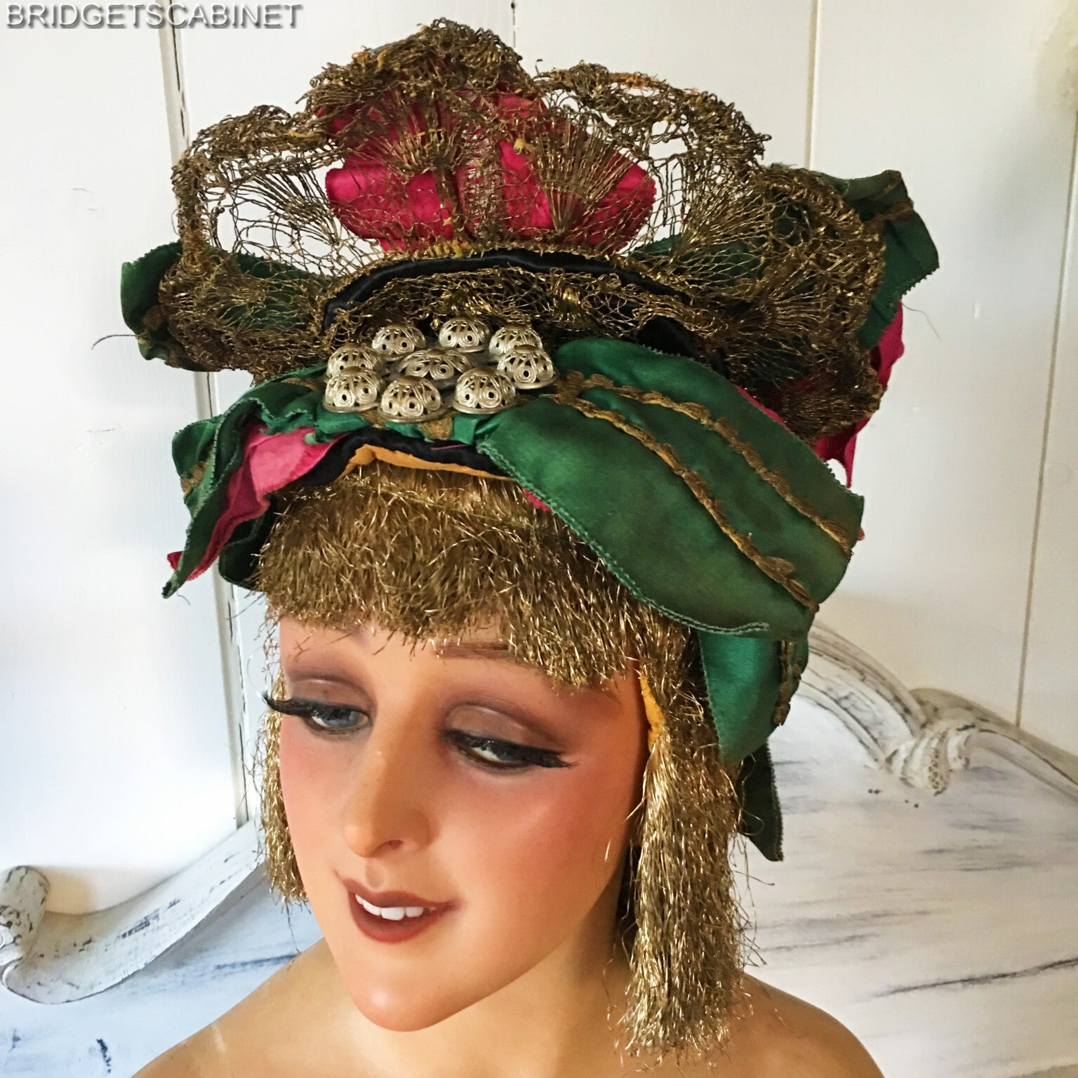 Bridget found this beautiful 1930's stage headpiece, we found this stunning item in an old stockroom of a French theater, this beautiful French Follies headpiece is accessorized with all kind of different materials and is hand-made, once probably part of a costume , it has two ornaments, silk, gold lame and velvet. this headdress is still in stunning condition and ready for wearing or displaying.