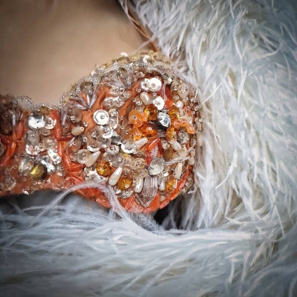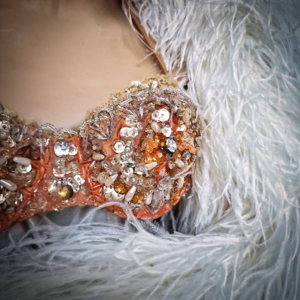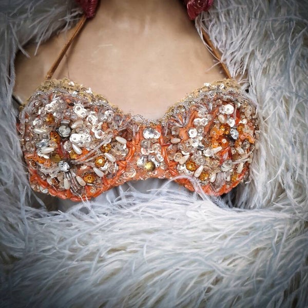 Step into the glamour of vintage Parisian burlesque with our exquisite Original Folies Bergère Theater Show Bra Top. Crafted in shimmering gold and silver tones with a delightful orange peach accent, this piece exudes timeless elegance. Adorned with glass stones, beads, rhinestones, and pearls, alongside a cascade of gold sequins, it captures the allure of the stage. Inside, discover a luxurious green satin lining bearing the name of the dancer who once graced it. A treasured relic of dance history, this bra is not just a collectible but also a wearable work of art. Securing with a vintage hook at the back, it offers both charm and functionality. Elevate your wardrobe with this enchanting piece that embodies the spirit of the legendary Folies Bergère theater.