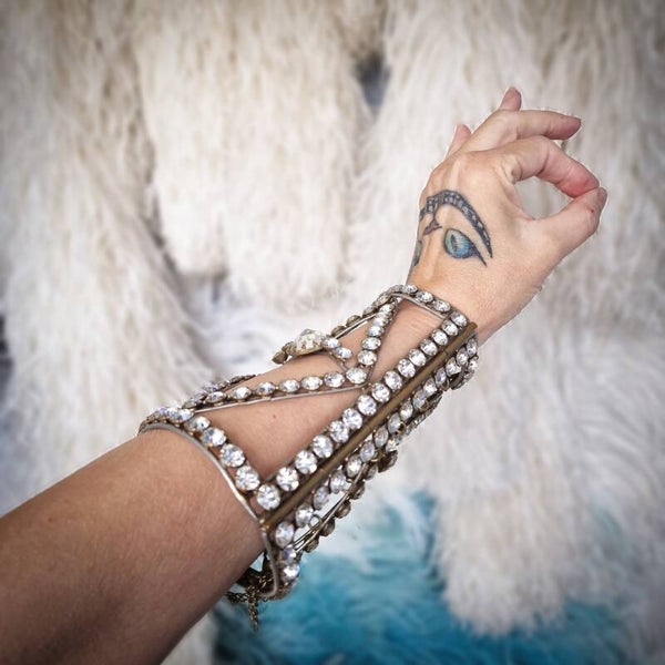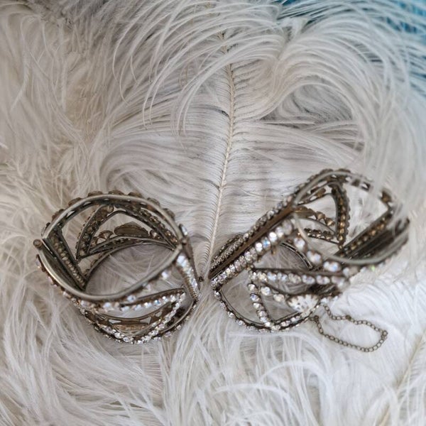 For sale: a stunning pair of stage dancing bracelets or arm cuffs, used in the French Folies during the late 1800s. These bracelets are adorned with rhinestones and feature a long sliding pin for opening, as shown in one of the attached pictures. This is a very rare find.