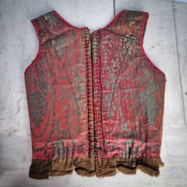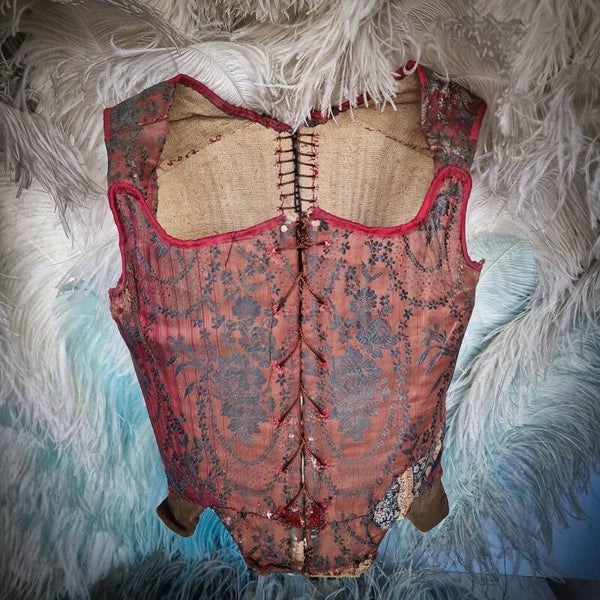 a unique and original pair of museum-worthy antique stays from early 18th century Italy. Crafted from exquisite brocade silk, these stays were likely a vibrant red when first made but have gracefully faded over the centuries. They feature ribs made of reed or wood bents, adding to their historical significance.